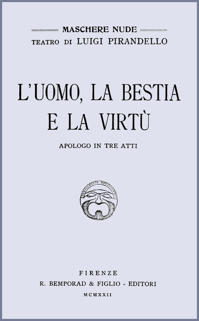 Con me, me la piglio! me la piglio col tempo! e me la piglio anche con tutti, sissignori! Perchè io voglio aria! aria! io sono abituato al mare! (Poi, calmandosi). E la terra, caro professore, specialmente d’estate, la terra non la posso soffrire.... — la casa.... le pareti.... gli impicci.... le donne....
