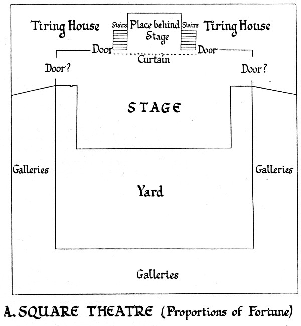 There has been a general abandonment of the hypothesis, which found favour when De Witt’s drawing was first discovered, of a division of the stage into an inner and an outer part by a ‘traverse’ curtain running between the two posts, perhaps supplemented by two other curtains running from the posts back to the tire-house.[230] Certainly I do not wish to revive it. Any such arrangement would be inconsistent with the use of the tire-house doors and gallery in out-of-door scenes; for, on the hypothesis, these were played with the traverse closed. And it would entail a serious interference with the vision of such scenes by spectators sitting far round in the galleries or ‘above the stage’. It does not, of course, follow that no use at all was made of curtains upon the stage. It is true that no hangings of any kind are shown by De Witt. Either there were none visible when he drew the Swan in 1596, or, if they were visible, he failed to draw them; it is impossible to say which. We know that even the Swan was not altogether undraped in 1602, for during the riot which followed the ‘cousening prancke’ of England’s Joy in that year the audience are said to have[79] ‘revenged themselves upon the hangings, curtains, chairs, stooles, walles, and whatsoever came in their way’.[231] It is not, indeed, stated that these hangings and curtains were upon the stage, and possibly, although not very probably, they may have been in the auditorium. Apart, however, from the Swan, there is abundant evidence for the use of some kind of stage hangings in the public theatres of the sixteenth century generally. To the references in dialogue and stage-directions quoted in the footnotes to this chapter may be added the testimony of Florio in 1598, of Ben Jonson in 1601, of Heywood in 1608, and of Flecknoe after the Restoration.[232] We can go further, and point to several passages which attest a well-defined practice, clearly going back to the sixteenth century, of using black hangings for the special purpose of providing an appropriate setting for a tragedy.[233] Where then were these hangings? For a front[80] curtain, on the public stage, as distinct from the Court stage, there is no evidence whatever, and the precautions taken to remove dead bodies in the course of action enable us quite safely to leave it out of account.[234] There may have been hangings of a decorative kind in various places, of course; round the base of the stage, for example, or dependent, as Malone thought, from the heavens. But the only place where we can be sure that there were hangings was what Heywood calls the ‘fore-front’ of the stage, by which it seems clear from Florio that he means the fore-front of the tiring-house, which was at the same time the back wall of the stage. It is, I believe, exclusively to hangings in this region that our stage-directions refer. Their terminology is not quite uniform. ‘Traverse’ I do not find in a sixteenth-century public play.[235] By far the most common term is ‘curtain’, but I do not think that there is any technical difference between ‘curtain’ and the not infrequent ‘arras’ or the unique ‘veil’ of The Death of Robin Hood.[236] ‘Arras’ is the ordinary Elizabethan name for a hanging[81] of tapestry used as a wall decoration, and often projected from a frame so as to leave a narrow space, valuable to eavesdroppers and other persons in need of seclusion, between itself and the wall. The stage arras serves precisely this purpose as a background to interior scenes. Here stand the murderers in King John; here Falstaff goes to sleep in 1 Henry IV; and here too he proposes to ‘ensconce’ himself, in order to avoid being confronted with both his ladyloves together in The Merry Wives.[237]