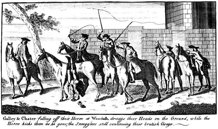 Galley & Chater falling off their Horse at Woodash, draggs thier Heads on the Ground, while the Horse kicks them as he goes; the Smugglers still continuing thier brutish Usage.