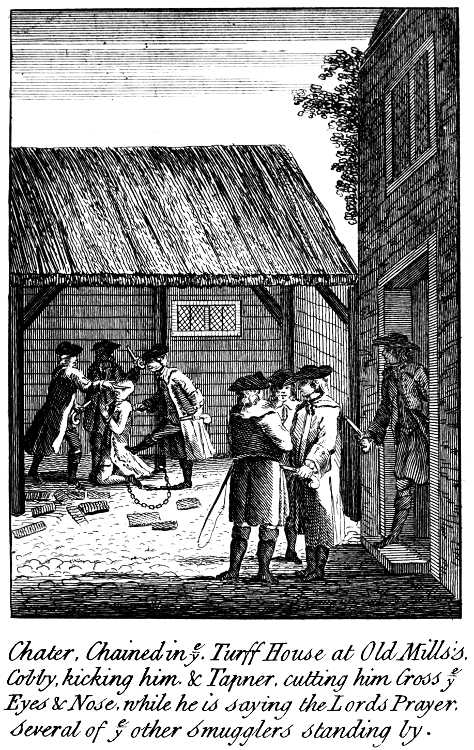 Chater, Chained in ye Turff House at Old Mills’s. Cobby, kicking him & Tapner, cutting him Cross ye Eyes & Nose, while he is saying the Lords Prayer. Several of ye other Smugglers standing by.