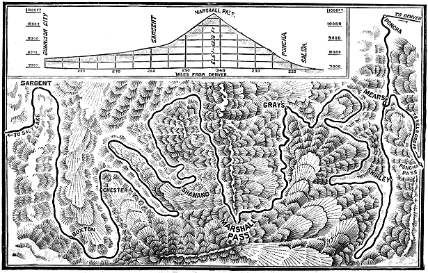 Marshall Pass.—Begins six miles from Poncha Junction, at Mears Junction. The summit of the Pass has an altitude of 10,852 feet. From this point a magnificent view can be had of the Sangre de Cristo range extending to the southeast. The pass is a scenic and a scientific wonder, grades of 211 feet to the mile are frequent, and the ascent and descent are made by a series of most remarkable curves. The streams from the summit flow eastward into the Atlantic and westward into the Pacific.