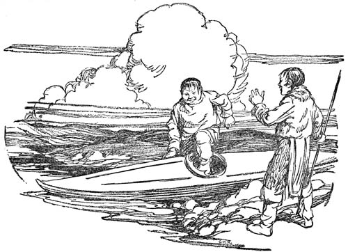 Noashak was not a bit nice in a temper. She[13] climbed up the back of the load, and Kak cried to the other girls to pull her down, but they only scampered away laughing; then he had to stop and go around and pull her off himself. She kicked and slapped him and climbed up immediately they started. Kak came and pulled her down again and again; but in the end he had to let her ride because she screamed and yelled so. This sort of welcome, repeated, delayed him a whole lot, yet he had brought his two loads when the far edge of the ice floe dented the sun’s gleaming disk; and after that he brought one more. It was good work for a boy. He felt proud of himself and showed it, crowing over the girls.