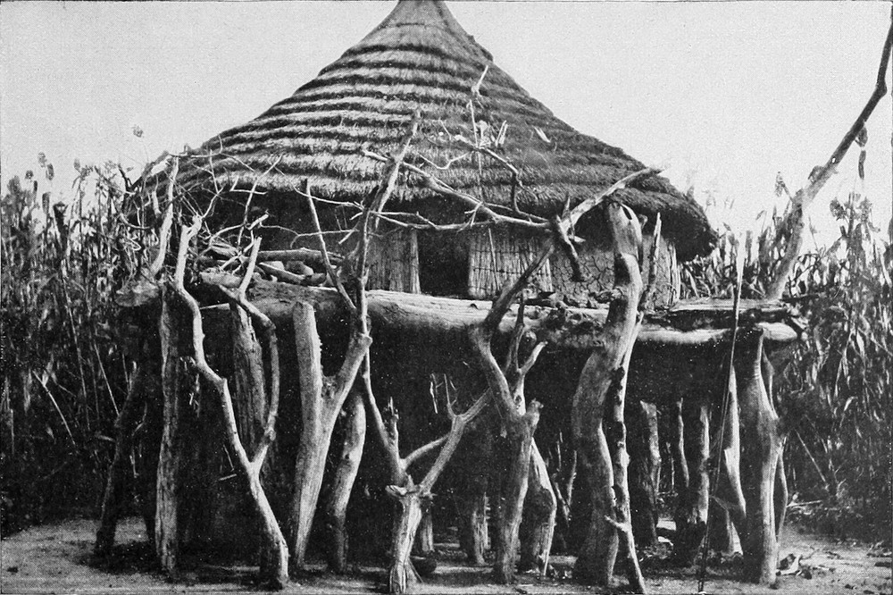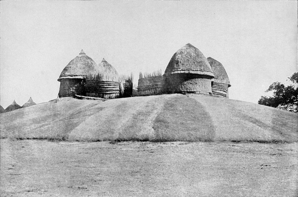 Alle Stämme Westafrikas haben bereits eine seßhafte Lebensweise angenommen. Sie wohnen entweder in runden Hütten, die aus aufeinandergeschichteten kreisförmigen Ringen aus Lehm aufgebaut sind und ein Kegeldach tragen (Abb. 30), oder in rechtwinkligen Giebeldachhäusern beziehungsweise in Übergangsformen zwischen beiden. In einzelnen Gebieten finden sich die Gehöfte (Hütten und Wirtschaftsgebäude) durch eine gemeinsame Umfassungsmauer zu einer Art Festung umgewandelt (Abb. 29). Die einzelnen so in sich geschlossenen Gehöfte sind wieder durch Löcher in den Mauern miteinander verbunden, so daß auf diese Weise wirkliche Labyrinthe entstehen. In Togo haben diese festungsähnlichen Anlagen eine besondere Form angenommen, die der Tambermaburgen. Dieselben sind dadurch gekennzeichnet, daß man zwei solcher umfriedigter Gehöfte aufeinander gesetzt hat, von denen das untere die Wirtschafts-, das obere die Wohnräume enthält (Abb. 28). Der Aufgang zu den Plattformen erfolgt auf Stiegen aus Lehm oder auf ausgehauenen Baumstämmen. — Als Erwerbsquelle der Neger steht der Feldbau im Vordergrund, daneben wird aber auch vielfach noch Viehzucht getrieben und ganz allgemein die Jagd (Abb. 31). An der Küste erstreckt sich diese auch auf das Wasser. Jedoch entwickeln die Neger auch eine gewerbliche Tätigkeit. Ehe europäische Erzeugnisse Eingang fanden, war die Hausindustrie in hoher Blüte, aber auch jetzt noch wird in mancher Hinsicht Bemerkenswertes[S. 4] geleistet. Die Eisengewinnung und Schmiedekunst ist ein in Afrika bodenständiges Handwerk; ebenso erfreuen sich Weberei und Töpferei ziemlicher Verbreitung. — Auch auf gewissen Gebieten der bildnerischen Kunst besitzen die westafrikanischen Neger eine große Geschicklichkeit. Berühmt sind die Bronzearbeiten und Elfenbeinschnitzereien aus Benin; die Aschanti sind vorzügliche Goldschmiede, die Yoruba Elfenbeinschnitzer.