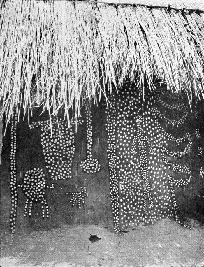 Die Wöchnerin gilt allgemein für unrein und darf erst nach einer gewissen Zeit, für gewöhnlich nach acht Tagen, ihr Haus verlassen; bis dahin bleibt sie mit ihrem Kinde abgesondert; eine Übertretung dieser Vorschrift würde für beide von großem Schaden sein. Das neugeborene Kind wird bei den Ekoi zwischen zwei Palmblätter gelegt und muß entweder von der Mutter selbst oder von der Großmutter zur Schwelle des Hauses gebracht werden; hier schüttet eine weibliche Verwandte Wasser aufs Dach, von dem das Kind Tropfen abbekommen muß, damit es nicht an Fieber erkranke. Eine Woche später bedeckt man es mit weißer Kreide, was Glück bringen soll, und trägt es umher, damit die Freunde der Familie es sehen. Die erste Locke wird von der Großmutter abgeschnitten, in einen Lappen gewickelt und in einem Kasten versteckt. Späterhin wird das Handgelenk eingeschnitten und Zaubermedizin in die Wunde eingerieben; diese wird entweder aus dem Zeigefinger des Schimpansen hergestellt und soll dann Kraft verleihen oder durch Zerquetschen schwarzer Ameisen gewonnen, was Regsamkeit geben soll. — Die Ngumba (Südkamerun) lassen ihr Neugeborenes am anderen Morgen je nach seinem [S. 38]Geschlecht entweder von einem heranwachsenden Burschen oder von einem Mädchen auf ein großes Blatt, auf das die Mutter eine mit Wasser angerührte Masse aus Rotholzfasern (Abb. 70) und Baumrinde gestrichen hat, vor die Haustür legen. Mit dieser „Medizin“ zeichnen die Umstehenden sodann einen Längsstrich auf die Brust des Kindes, ebenso der Träger sich selbst auf die Fußsohlen. Außerdem werden ähnliche Striche auf die Schwelle und die Türpfosten gemalt. Dieser Vorgang spielt sich vor einem jeden Hause des Dorfes ab. Verschiedentlich wird die junge Mutter nach der Geburt ausgeräuchert, offenbar um die bösen Geister von ihr fernzuhalten. Die Neger der Goldküste bringen nach der Geburt ihrem Fetisch Opfer dar und hängen den Neugeborenen Amulette um den Hals. — Die Negerin schleppt ihr Kleines beständig mit sich herum und hat es auch bei der Arbeit bei sich (Abb. 78).