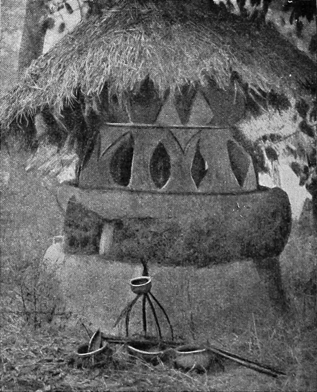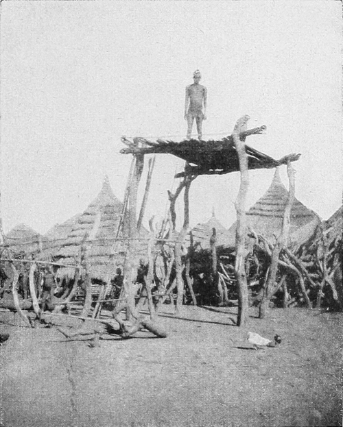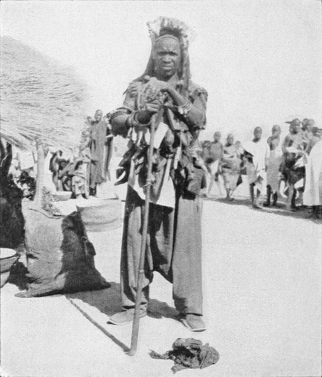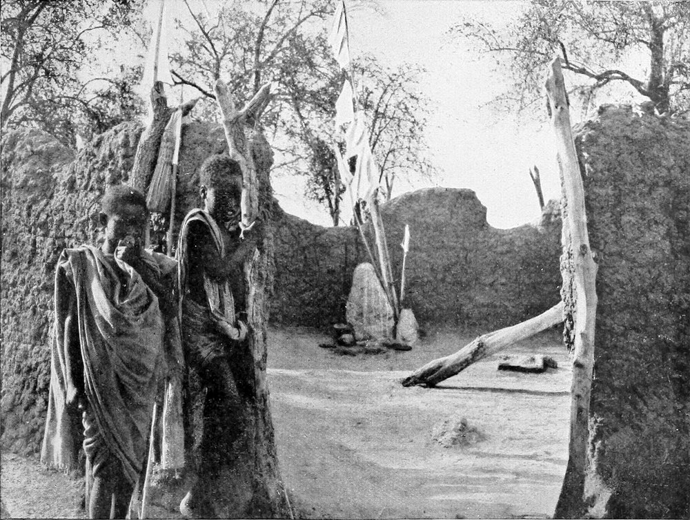 Was die religiösen Verhältnisse der Westafrikaner anbetrifft, so hat vielfach unter ihnen, besonders im Sudan, der Mohammedanismus seit langem Anhänger gefunden, wodurch natürlicherweise die Gebräuche des einheimischen Kultus im allgemeinen dem Untergange geweiht sind. Dessenungeachtet haben sich dieselben verschiedentlich meist im geheimen, aber auch öffentlich, weitererhalten. Sogar für den zum Islam bekehrten Haussa ist die Welt mit allerlei Geistern oder Bori bevölkert, die seiner Ansicht nach meistens bösartig sind oder doch immerhin bei der geringsten Herausforderung Unheil anrichten, weswegen er bemüht ist, sie zu versöhnen[S. 6] (Abb. 1), oder wenigstens darauf bedacht, alles zu vermeiden, was ihre Aufmerksamkeit auf ihn lenken könnte. Die meisten dieser Bori sind Krankheitsgeister, manche von ihnen möglicherweise durch die Araber eingeführt, viele dagegen altheidnischen Ursprungs. Eine große Rolle spielten unter ihnen der Geist, der das Fieber, sowie der, der die Pocken schickt oder mitbringt. Die Abwehrmaßregeln (Abb. 33), die zum Beispiel die Neger der Goldküste gegen die Einführung der Pocken anwenden, sind besonders interessant. Zum Schutze gegen diesen Geist, der wie ein schleichendes Tier die Krankheit besonders bei Nacht ins Dorf bringt, stellen sie am Eingang desselben einen Wächter auf, aber nicht in Gestalt einer lebenden Person, sondern eines Amaga, das ist eines Idols, das ein auswärtiger Künstler der Dorfgemeinde auf ihre Kosten anfertigt. Kommt das Pockengespenst nun bei Nacht daher, dann stößt es auf diesen unter einem kleinen Dache sitzenden Wächter, erschrickt und kehrt um. Außerdem stellt man am Eingang zum Dorfe einen oder mehrere, etwa einen Drittelmeter hohe Zäune quer über den Weg, über die der Geist stolpern und gleichfalls durch Schreck zum Rückzug gezwungen werden soll. Auch kommt es vor, daß man allen mit tiefer Stimme krähenden Hähnen des Dorfes den Hals umdreht in der Meinung, daß dann der Pockengeist, wenn er am frühen Morgen beim Dorfe vorbeikommt, nicht mehr durch das Krähen auf dasselbe aufmerksam gemacht werden könne. Noch kindischer ist ein anderes Mittel, um die Aufmerksamkeit des Gespenstes abzuwenden, nämlich das Wuchernlassen des Grases auf den Hauptwegen, die zum Dorfe führen. Auf jedem vielbegangenen Wege pflegt der Graswuchs nur sehr gering zu sein. Findet der Pockengeist nun, daß ein Weg mit Gras bewachsen ist, dann nimmt er an, daß derselbe nicht begangen worden sei, somit auch zu keiner Ortschaft führen könne; er geht also vorüber.