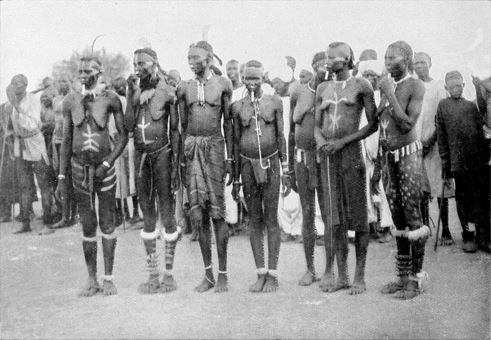Die heranwachsenden jungen Leute treten entweder dem Poro- oder Bundubund bei, je nach ihrem Geschlecht. Ihre Aufnahme geht unter der größten Geheimnistuerei in der Abgeschlossenheit eines besonderen Poro- oder Bundubusches vor sich. Die Ausbildung, die für die Aufnahme in den Bund erforderlich ist, kann auf jeder Altersstufe zwischen sieben und zwanzig Jahren vorgenommen werden, dauert aber nur wenige Monate. Ein Knabe besitzt keinen eigentlichen Namen, bevor er in den Porobusch geht; er erhält einen solchen erst bei der Aufnahme. Zum Zeichen dessen wird er auf beiden Seiten längs des Rückgrats mit einem Grätenstichmuster gezeichnet, das er beständig trägt, so daß man ein Poromitglied sogleich daran erkennen kann. Die Aufnahmeförmlichkeiten (Abb. 49) erfordern viel Strenge und Entsagung; doch wird den Adepten gelegentlich auch eine Erholung außerhalb des Busches ermöglicht, für gewöhnlich in Form einer Tanzerei in der nächstgelegenen Stadt.[S. 19] Die letzte Aufnahmeförmlichkeit heißt „den Teufel austreiben“. Der Poroteufel befindet sich, wie man behauptet, im Busch, und die Knaben müssen ihn, da er, obwohl auch nur ein Mensch, mit allerlei zauberischen Kräften ausgestattet sein soll, auf eine bestimmte Art vertreiben, bevor sie den Busch verlassen dürfen. Daher drehen sie am festgesetzten Tage ein langes Seil aus dem den Poro versinnbildlichenden Farn „Kane“ und leiten es während der Nacht aus den oberen Zweigen eines Baumes im Busch auf die daneben stehenden Bäume. Die Bewohner der Stadt und der umliegenden Dörfer werden durch großes Geschrei aufgeweckt, das Seil wird ihnen gezeigt und gleichzeitig mitgeteilt, daß an ihm der Teufel sich zum Firmament begeben habe. Die Knaben gehen dann in der Stadt umher und werden nach weiteren geheimen Zeremonien Mitglieder des Poroordens.