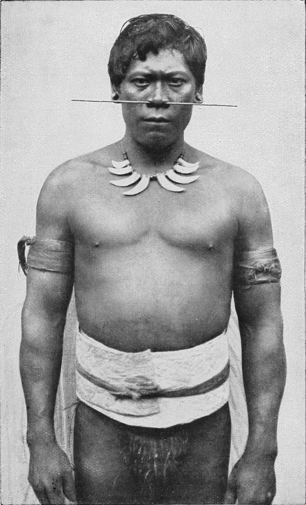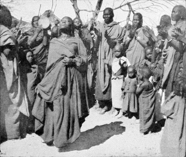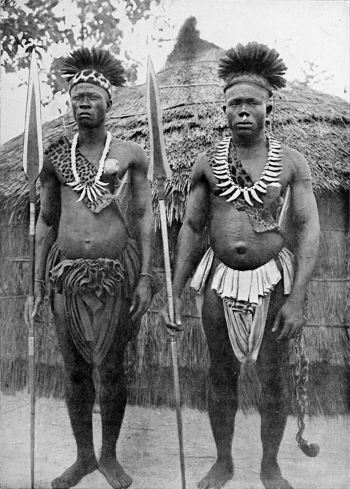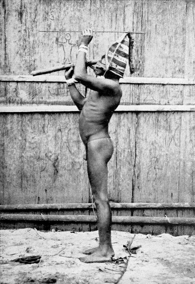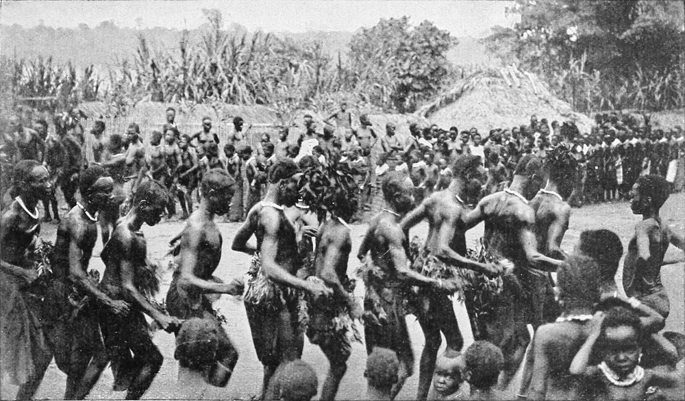 Die jungen Eltern setzen ein solches Paar zunächst von dem Erscheinen der Zwillinge in Kenntnis. Die Eingeladenen finden sich ein und lassen zunächst die neuen Zwillingseltern sich den Mund mit Wasser ausspülen, binden ihnen Blätterteile bestimmter Pflanzen (Palmen- und Gurkenart) um Hals, Knie, Arm und Fuß und baden die Zwillingskinder in der Nähe des Ausganges in einer Wanne, worauf die Eltern ihren Blick in einer bestimmten Richtung dem Sitze[S. 36] vieler Gottheiten zuzuwenden und weiter zwei Zwillingstänze unter Trommel- und Flötenbegleitung aufzuführen haben. Vorher aber müssen sie neunmal um die Trommeln herumgehen und während des Tanzes Pfeil und Bogen in der Hand halten. Es sind dies ganz besondere Trommeln, zu deren Klange nur Leute tanzen dürfen, die Zwillinge gezeugt, Leoparden getötet oder im Kriege jemand den Kopf abgeschnitten haben. Nach dem Tanze werden die Zwillinge in ein neues Lendentuch gewickelt. Weiter erfordert die Sitte, daß die Eltern an der Vorderseite ihres Hauses eine Art Gosse anlegen und nur das hier sich sammelnde Regenwasser, nicht das von der Hinterseite des Daches herabfließende trinken. Damit sind indessen die Förmlichkeiten des Venovidzidzi noch nicht erschöpft. Die Mutter muß sich das Kopfhaar scheren lassen bis auf drei, der Vater bis auf zwei Haarbüschel. Den Zwillingseltern ist es ferner verboten, das Fleisch des roten Affen zu essen, und anderes mehr. Erst wenn alle diese und noch andere Vorschriften erfüllt worden sind, ist es ihnen gestattet, sich wieder überall frei zu bewegen. Natürlich fehlt es auch hier nicht an einem Festmahl.
