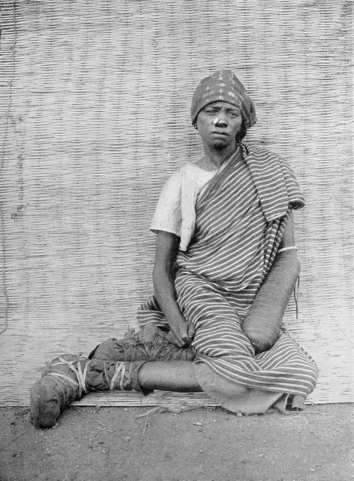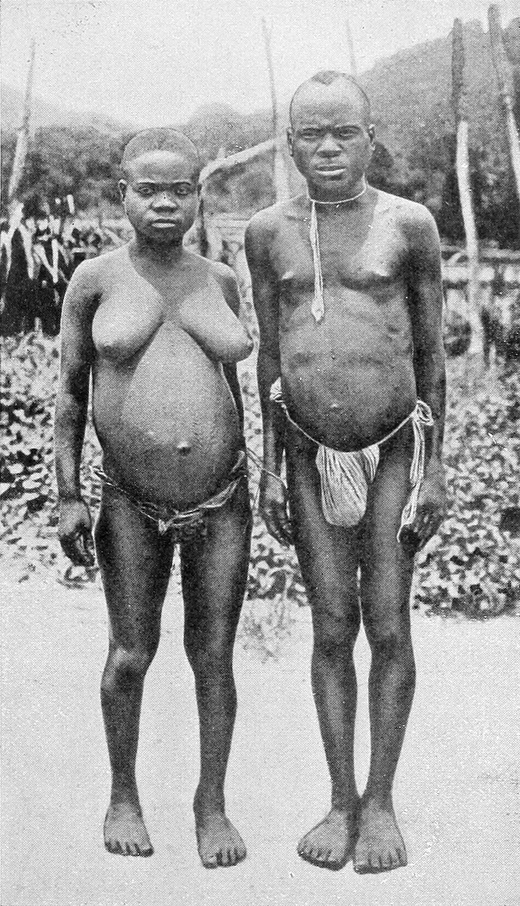 Die schwangere Akkrafrau läßt deutlich auch nach außen hin ihren Zustand erkennen, indem sie ihre Tracht ändert. Sie läßt ihr Haar wachsen, stellt das Schminken ein und legt ihren Korallenschmuck ab; dafür wird ihr von der Priesterin eine Art Manschetten aus Bast im ersten Monat um die Handgelenke, dann um die Knie und in den letzten Monaten in dicken Wülsten um die Knöchel geschlungen, von denen überdies noch Knoten herabhängen, dies alles, um die Geburt zu erleichtern. Je näher ihre schwere Stunde rückt, um so mehr wird sie mit Amuletten behängt. In den letzten acht Tagen bestreicht ihr die Priesterin den Kopf außerdem noch mit einer weichen Masse, die diesen wie eine dicke Kappe bedeckt und erst nach der Geburt entfernt werden darf. Wird die Negerin der Goldküste zum ersten Male schwanger, dann treibt man sie unter Bewerfen mit Kot und unter Geschimpfe ins Meer, wo sie untertauchen muß. Von dem Tage an, an dem eine Ekoifrau merkt, daß sie Mutter werden wird, muß sie besondere Vorsichtsmaßregeln beobachten, aus deren Unterlassung Unheil entstehen könnte. So darf sie zum Beispiel nicht in die Nähe eines bestimmten Baumes gehen, dessen Rinde beim Fischen Verwendung findet; sie darf weder die Blätter des Kürbisses noch das Fleisch des Stachelschweines, des Wasserbisams oder des Elefanten essen; ihr Gatte steht, was den letztgenannten Leckerbissen anbelangt, unter dem gleichen Tabu. Ferner muß die Schwangere ihrem Hausfetisch opfern; zu diesem Zwecke füllt sie für gewöhnlich einen Topf oder auch eine Kalabasse mit Essen und durchsticht[S. 34] das Ganze mit einem Speer. Auch die Ewenegerin bringt den Fetischen der Geburt Opfer dar und wird von den Priestern mit allerlei Amuletten am ganzen Körper behängt. Der Hilfsmittel, die die Geburt erleichtern sollen, gibt es viele. Bei Agitome in Togo fanden sich bei einer bevorstehenden Entbindung vor dem Dorfe kleine rohgeformte Tonfiguren aufgestellt, die anscheinend den bösen Geistern den Zutritt verwehren sollten. Die Malangefrauen tragen stets eine kleine Kalabasse, die mit Erdnüssen und Palmöl gefüllt ist, bei sich, um eine leichte Entbindung zu haben.