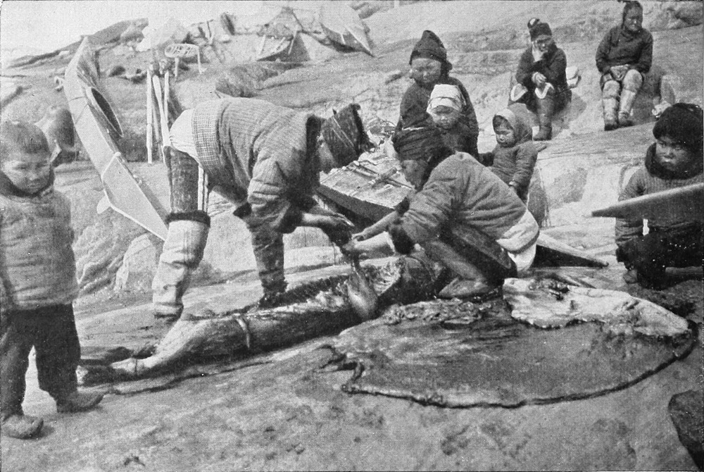 Die Lappen führen alle ein äußerst bescheidenes Leben. Zum größten Teile sind sie Jäger und Fischer. Die umherziehenden Lappenstämme wohnen im Winter am Saume der großen Wälder und sorgen hier für ihre Herden. Kommt der Sommer, dann verlassen sie ihre kegelförmigen Fellzelte und ziehen in die Berge, den Renntieren nach, die frei umherlaufen.[S. 410] Bei der Rückkehr in die Zelte fangen sie ein Tier aus der Herde ein und hängen ihm eine Glocke um den Hals; durch diese werden die übrigen Tiere herbeigelockt und dann durch Hunde zusammengetrieben und zusammengehalten. Die Hunde spielen im Leben der Lappen eine wichtige Rolle als Haustiere; sie sind die ständigen Begleiter ihrer Herren, gehen sogar in die Kirche mit ihnen und halten sich während des Gottesdienstes bei ihnen auf; teils liegen sie dann still, teils balgen sie sich auch miteinander herum. Sie dienen zur Bewachung der Renntierherden. Auf ihren Reisen ziehen die Lappen in Schlitten (Abb. 455) oder auf Skiern (Abb. 446) umher und führen spatenähnliche Stöcke mit sich, um mit ihnen das Moos unter dem Schnee für die Renntiere auszugraben, die es sich übrigens auch selbst mit den Vorderhufen hervorholen. — Die Küstenlappen leben ausschließlich vom Fischfang, bei dem sie eine überraschende Geschicklichkeit bekunden.