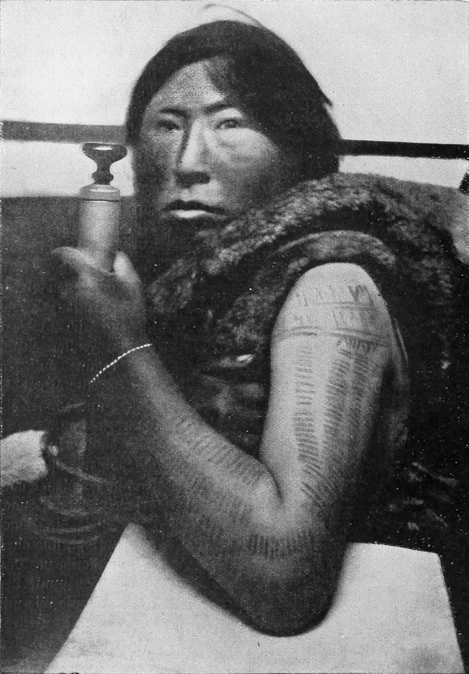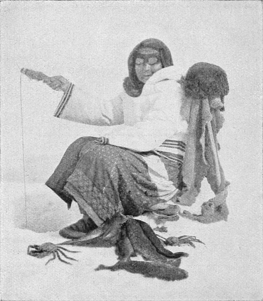 Männer und Frauen sind fast gleich gekleidet (Abb. 448). Sie tragen Beinkleider aus Fell, die in hohen Pelzstiefeln stecken, ein Wams und eine mit einer Troddel geschmückte Spitzmütze. Die Küstenlappen pflegen während des Sommers an Stelle der sonst üblichen Gewänder[S. 409] aus Renntierfellen solche aus blauem Tuch von demselben Schnitt zu tragen, die meist mit reicher roter Stickerei versehen sind.