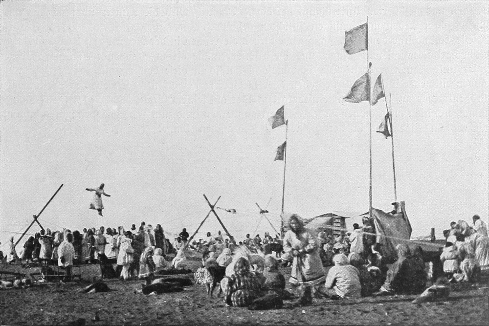 Drei Tage vor der Hochzeit findet eine Vorfeier statt, zu der die Stammesgenossen zusammenkommen;[S. 436] die Brautleute tauschen dabei bunte Tücher oder Ringe aus. Bei einigen Stämmen holen die Weiber am letzten Tage vor der Hochzeit junge Bäume aus dem Walde, die sogenannten Glückstangen, und stellen sie vor der Wohnung des Bräutigams auf, damit seine Liebe zu seiner Auserwählten in Zukunft „holzfest und immergrün“ erhalten bleibe, er muß sie für diese Aufmerksamkeit mit Branntwein belohnen. Schon am frühen Morgen des Hochzeitstages finden sich die Gäste vor dem Zelte ein und bringen dem Brautpaar allerlei Geschenke dar, meist in Gestalt von Eßwaren und Getränken, aber auch von hauswirtschaftlichen Gegenständen und Geld. Darauf begeben sich alle Teilnehmer unter Vorantritt von Musikanten, aber zunächst ohne Sang und Klang, in festlichem Zuge in die Kirche. Zuerst der Bräutigam, umgeben von den Burschen und Männern, darauf in bestimmter Entfernung die Braut in Begleitung der Frauen und Mädchen sowie eines einzigen, und zwar des ältesten Burschen, der aufzupassen hat, daß die Braut nicht entführt werde. Ist er dabei nachlässig, so muß er einen Teil der Hochzeitskosten tragen. Nach der Trauung begibt sich der Zug unter Gejohle und Musizieren wieder zum Zeltlager zurück. Hier angekommen, wird das junge Paar mit Nüssen beworfen, früher auch mit Hirse, mit Wasser begossen und dann mit einem Beutel aus Wieselfell, der Stechapfelsamen enthält, abgerieben, was gegen Unglück und bösen Blick schützen soll; beim Betreten des Zeltes werden ihm Schuhe und Stiefel nachgeworfen, was die Fruchtbarkeit steigern soll, und so fort.