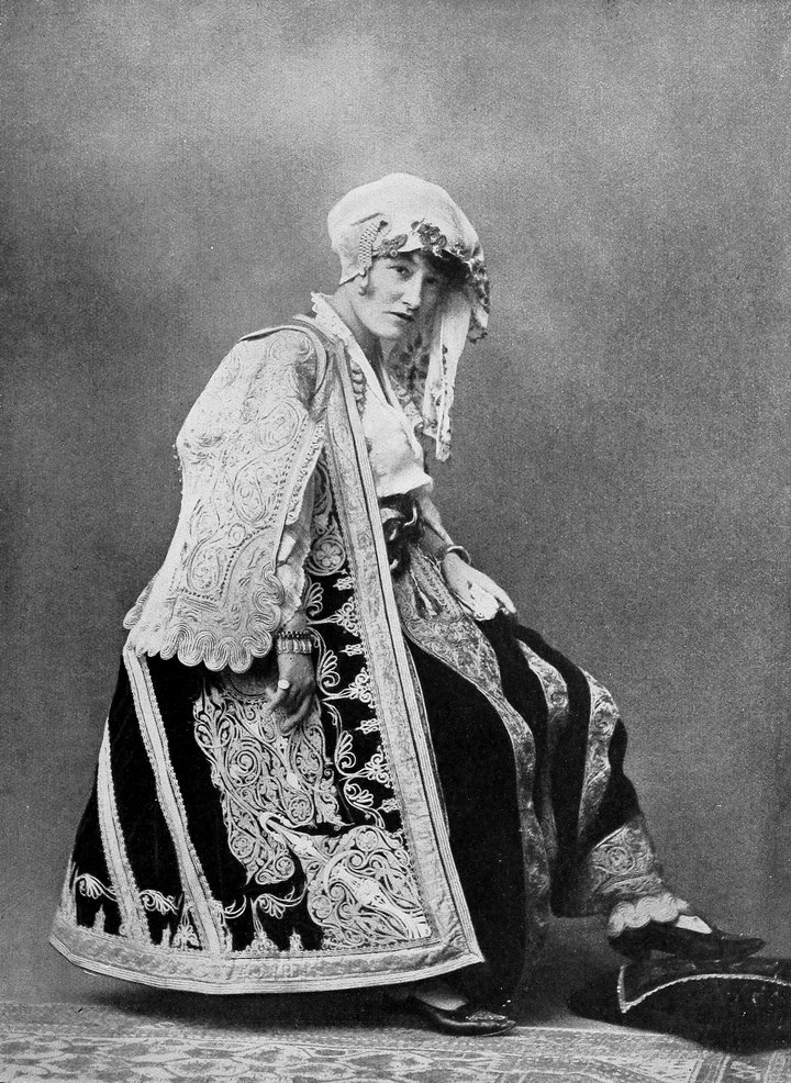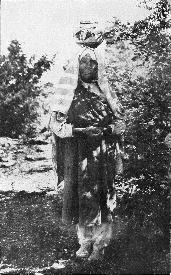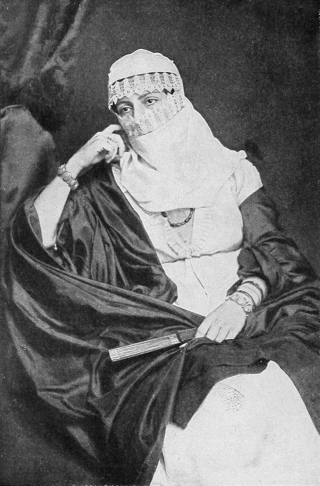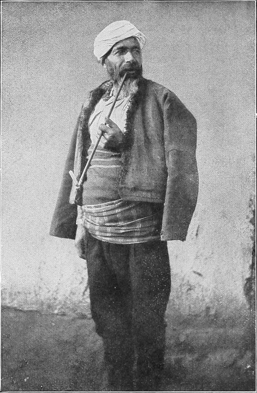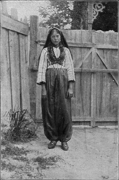 Die Kleidung der Türken (Abb. 428) ist eine ziemlich einförmige; sie besteht aus einem[S. 391] langen, kaftanähnlichen Rock, Pluderhosen und einem Fes, der bei festlichen Gelegenheiten mit einem weißen Turban vertauscht wird; dieser ist bei Mekkapilgern mit Gold durchwirkt und bei den Geistlichen, den Hodscha, mit einer purpurroten Verbrämung versehen. Die Türkinnen sind gekennzeichnet durch weite Pluderhosen, seidenes Hemd, gestickte Jacke, gelbe Schuhe und Verschleierung des Gesichts (Abb. 429). Die letztere dürfte kaum auf religiöse Vorschriften zurückzuführen sein — im Koran findet sich keine Stelle, die man in diesem Sinne auslegen könnte, und außerdem trugen die Frauen der Türken bereits lange vor Mohammed ihr Gesicht verschleiert —, sondern wahrscheinlich mit der Sitte der Türko-Tataren zusammenhängen, sich der Frauen durch Raub zu bemächtigen. Da man wohl nur solche Frauen raubte, die einem gefielen, dabei aber Gefahr lief, daß sie auch den Beifall anderer finden möchten, die stärker waren und sie wieder wegnehmen konnten, verfiel man auf den Gedanken, das Gesicht der geraubten Frauen zu verhüllen, um dadurch ein Urteil über ihr Aussehen unmöglich zu machen und ihrer Entführung vorzubeugen. Die Gewohnheit hat sich im Laufe der Zeiten fortgeerbt, scheint aber dank der modernen Reformbewegung auf dem Wege zu sein, mehr und mehr abzukommen.