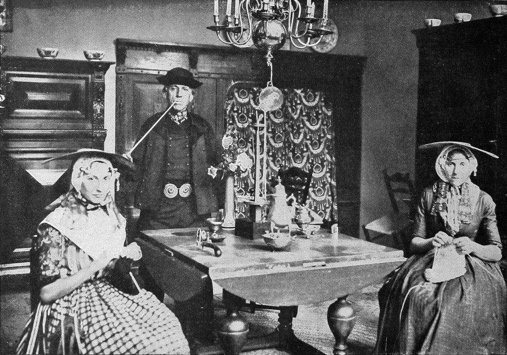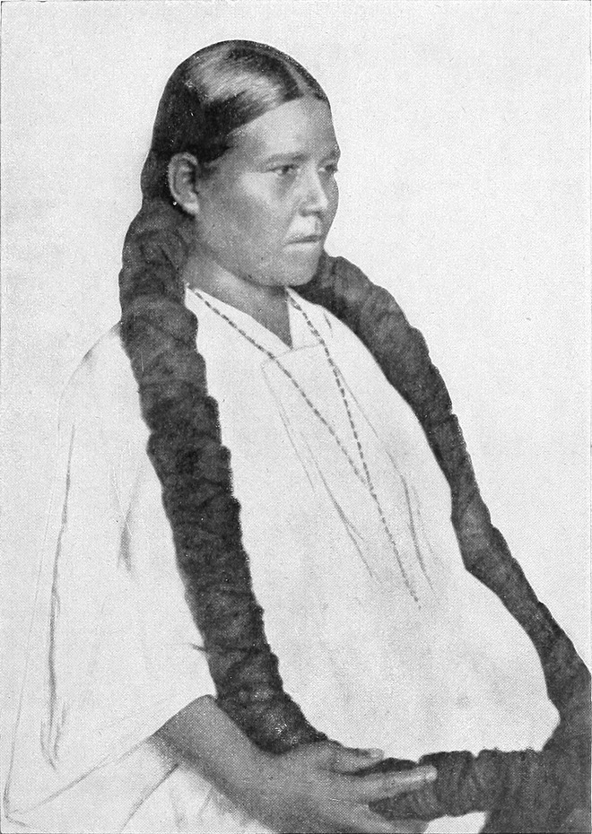 Wenn die Abschiedstunde für die junge Frau naht, wird ihr das Stirnband, das Zeichen der Mädchenschaft, abgenommen und hierauf ein Kasten, der voll Sachen sein muß, in die Frauenecke gebracht. Die junge Frau setzt sich auf ihn, nachdem ein Verwandter sie dreimal um den Kasten geführt hat. Jetzt bemächtigen sich ihrer zwei alte Frauen, kämmen ihr das zuletzt lose herabhängende Haar und flechten es in zwei Zöpfe anstatt des bisherigen einen, den die Mädchen tragen. Der Zeremonienmeister übergibt ihr ein großes Tuch, mit dem sie vollständig verhüllt wird, so daß sie selbst nichts sieht und auch von niemand erblickt werden kann. Nur ein schöner kleiner Knabe zu ihren Füßen darf unter das Tuch sehen; man will sie dadurch an ihren zukünftigen Beruf als Mutter erinnern. Beim Zurechtmachen der jungen Frau singen zwei oder drei alte Frauen das Lied vom Anlegen des Kopfschmuckes. Das Gefolge des Mannes muß die Frauenecke verlassen, darf aber nur gegen Erlegung von Geld hinaus, das eine Freundin der Jungvermählten einsammelt. Nachdem dies geschehen ist, stellen sich die jungen Leute in einer Reihe auf dem Hofe auf und warten auf die junge Frau, die bald darauf von ihrem Paten hinausgeleitet wird. Sie ist[S. 422] noch immer mit dem Schleiertuch bekleidet und wird so vor ihren Gatten geführt, vor dem sie sich dreimal tief verbeugt. Dann übergibt der Pate sie dem Gatten mit einer kurzen Ansprache, in der er beiden Ratschläge erteilt. Unter anderem sagt er zu dem jungen Ehemann: „Gehorcht sie dir nicht, dann nimm einen Strohhalm und schlag sie damit; wenn sie dir dann noch nicht gehorcht, so nimm ein Birkenreis und tu das gleiche; gehorcht sie dir aber auch dann noch nicht, so nimm eine härtere Waffe, auch wohl eine Zuberstange, und schlag sie. Hüte dich aber davor, ihr dabei das Leben auszublasen, denn wir besitzen eine ausgedehnte Bekanntschaft, die bereit ist, die Pflicht der Blutrache zu übernehmen.“ Darauf geht der Mann dreimal um seine junge Frau herum und sieht unter die Verhüllung, um sich zu überzeugen, ob sie es auch in Wirklichkeit ist.