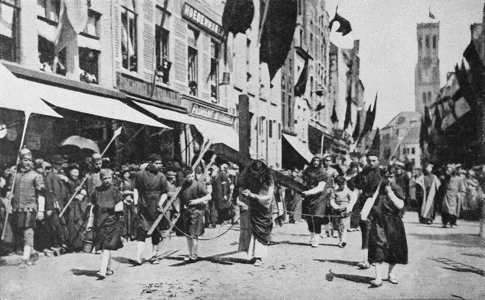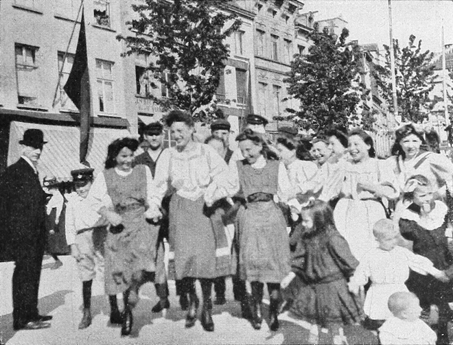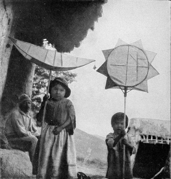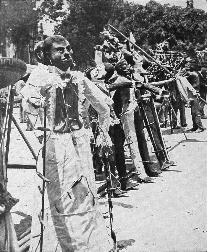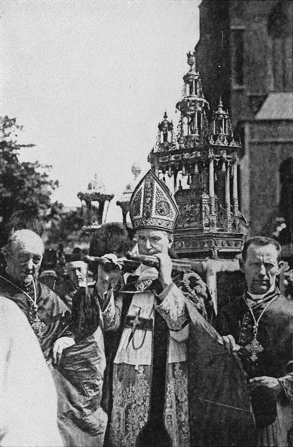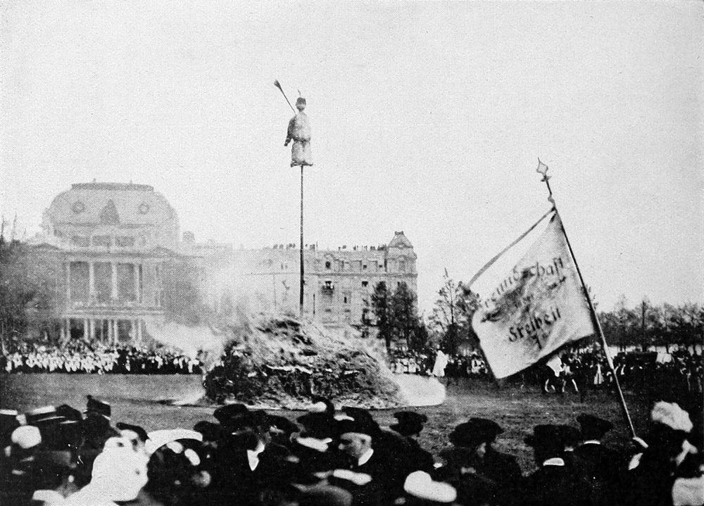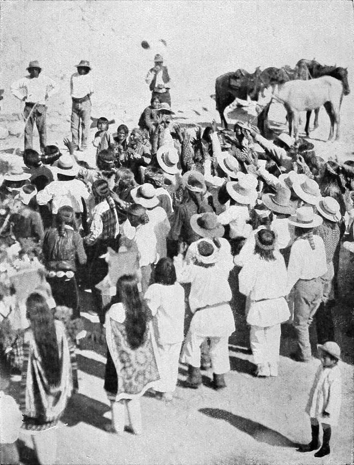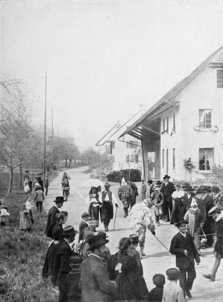 An den kirchlichen Festen finden fast immer Kinderumzüge statt, bei denen gesungen und um Almosen gebettelt wird. In der Karwoche, wo die Kirchenglocken nicht läuten dürfen, machen die Kinder Lärm mit Knarren. Am Tage vor Ostern bringen sie Wasser und Feuer in die Kirchen, lassen den priesterlichen Segen darüber aussprechen und schaffen beides dann in die elterlichen Wohnungen, damit die Häuser vor Blitzschlag und Ungewitter verschont[S. 428] bleiben. Mit demselben geweihten Wasser besprengt man auch das Korn auf den Feldern, um es vor allerlei Schädlichkeiten zu schützen und sein Gedeihen zu fördern. Für noch wirksamer gilt das Wasser, das man in der Johannisnacht schöpft. In der dem San-Juan-Tage (24. Juni) vorausgehenden Nacht strömen die Leute aus dem gesamten Baskenlande nach Cambos und eilen mit dem Glockenschlage zwölf auf die Brunnen zu, um sich in gierigen Zügen so viel einzupumpen, als sie nur fassen können; denn je mehr sie sich davon einverleiben, um so besser leben sie im neuen Jahre. Auch schleppen sie in Kesseln und Krügen schwere Lasten des heilkräftigen Wassers mit sich, um ihre Lieben zu Hause desselben ebenfalls teilhaftig werden zu lassen. Am Johannistage selbst segnet der Priester Blumen, meist Lilien und Weißdorn, die später an den Haustüren angebracht werden, ebenfalls zu dem Zwecke, Unheil abzuwehren.
