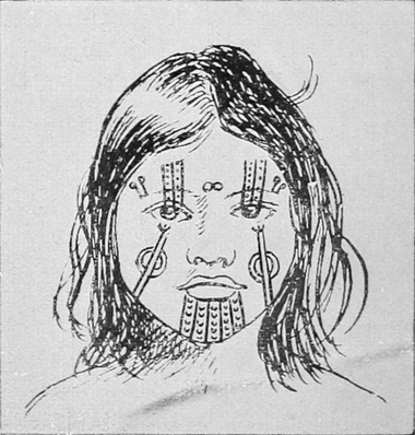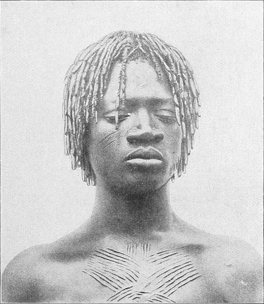 Schmuck wird allenthalben getragen in Gestalt von Schnüren aus Perlen oder Metallreifen um Hals, Arme und Leib (Abb. 8, 10 und 12). Auch begegnen wir vielfach der Ausdehnung der Lippen und der Ohrläppchen durch Einführung immer stärker werdender Gegenstände, bis sie ganze Scheiben zu halten[S. 3] vermögen (Abb. 15 und 16), die öfters mit Samenkörnern, Perlen und Zinnauslagen verziert sind. Ebenso wird verschiedentlich auch Nasenschmuck (Abb. 11), Perlen, Korallen, Vogelklauen und so weiter, getragen. Sehr beliebt sind Tatauierungen, sowohl im Gesicht wie auch am Körper. Diese Muster, die entweder in feinen Punkten oder in Strichen bestehen (Abb. 3, 4, 13 und 14), dienen teils als Stammes- oder Herkunftsabzeichen, teils als Kennzeichen bestimmter Lebensabschnitte. Bei vielen Stämmen beginnt man mit der Tatauierung bereits in der Kindheit und fügt aus bestimmten Anlässen (Reifezeit, Hochzeit) neue Muster hinzu. Bei den Haussa vermag man aus den Tatauierungszeichen herauszulesen, welcher Stadt sie entstammen und welches Gewerbe sie betreiben. Die größeren Einschnitte in die Haut werden vielfach durch Einreiben verschiedener Mittel an der frühzeitigen Heilung gehindert, so daß mit der Zeit aus ihnen daumendicke Narben hervorgehen, was um so leichter zu erreichen ist, als gerade bei den Schwarzen die Haut große Neigung bekundet, üppig zu wuchern (Keloidbildung; Abb. 17). Ganz eigenartig und abwechslungsreich sind die Haarfrisuren der Neger, im besonderen derer von Kamerun, so daß es unmöglich ist, sie im einzelnen vorzuführen (Abb. 18 bis 27).