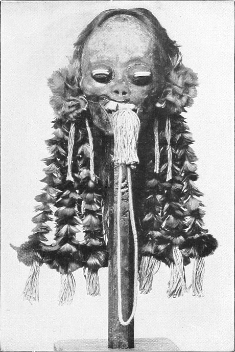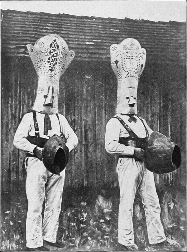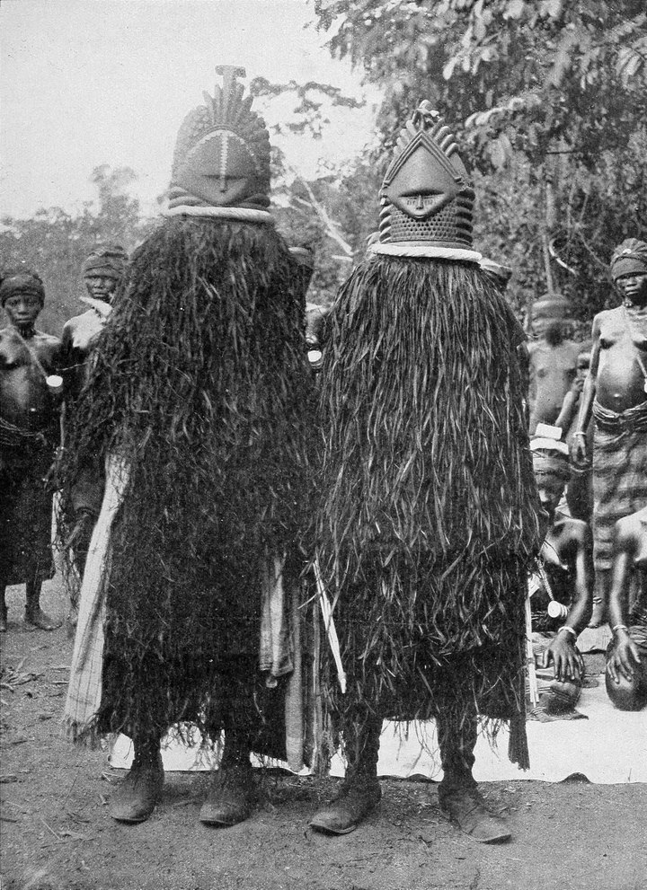 Damit sind wir zu dem Kapitel der Geheimbünde (Abb. 47 und 48) gekommen, die sich gerade in Westafrika einer ungeheuren Verbreitung erfreuen. Besonders Sierra Leone und Kamerun bilden gleichsam die Mittelpunkte dieser Bünde, über deren Einrichtungen es äußerst schwer hält Näheres zu erfahren, in Anbetracht der großen Verschwiegenheit, die ihre Anhänger üben. So viel indessen ist über die Ziele dieser Gesellschaften bekannt geworden, daß sie teils politische Absichten verfolgen sollen, wie die in Kamerun, teils die Erziehung der Knaben und Mädchen fördern sollen, teils auch mit dem Totenkult in Verbindung stehen oder auch nur profanen Zwecken dienen, wie zum Beispiel Tänze aus besonderem Anlaß aufzuführen, wie bei den Bakongo und Ukuku. Die Einrichtung der Geheimbünde an der westafrikanischen Küste kann auf ein hohes Alter zurückblicken, denn bereits 1668 erwähnt der Geograph Dapper ähnliche Gebräuche für die Eingeborenen der Pfefferküste.