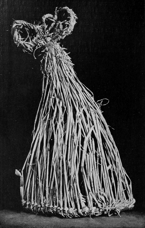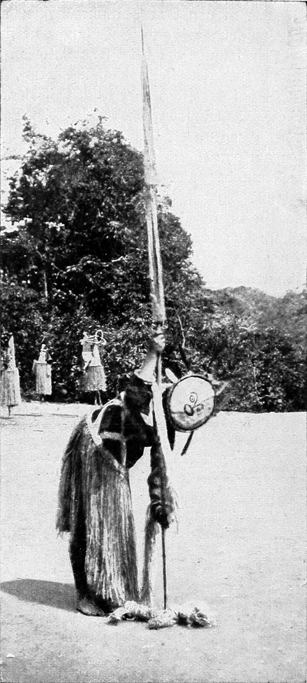 Der Binni (Abb. 50) ist der zweite Grad des Bundes; der Zutritt zu ihm steht den Mohammedanern offen. Der Teufel dieses Grades ist ein ganz besonders mächtiger, da er in einer Person den Fetischeinfluß des Heiden mit der Magie des mohammedanischen Mauren vereinigt. Dementsprechend ist auch seine Tracht zusammengesetzt. Der Körper ist von einem langen Gewand aus Pflanzenfasern umhüllt, der Kopf von einer Kappe aus Haut; das Gesicht ist gänzlich durch sie verdeckt, ein paar kleine Löcher ermöglichen jedoch das Durchsehen. Neben am Kopfe stehen ein paar Seitenklappen ab. Soweit geht der Ausputz auf heidnische Beeinflussung zurück. Dazu treten dann auf Brust und Rücken des Binni streng mohammedanische Abzeichen: viele kleine Holztafeln mit arabischer Schrift, die Zauberkraft besitzen; sie hängen am Gewande. Bei Bewegungen des Binni zittert alles an ihm, und das Geklapper der Täfelchen verstärkt den allgemeinen unheimlichen Eindruck, den bei den Zuschauern schon das Freudengeschrei der Mitwirkenden und das Geräusch von einem halben Hundert kleiner Bambusstäbe hervorrufen, die von den begleitenden Musikanten unaufhörlich angeschlagen werden.