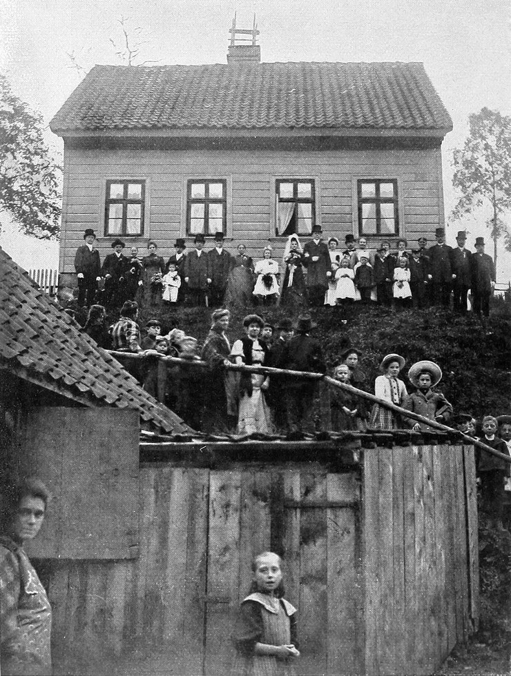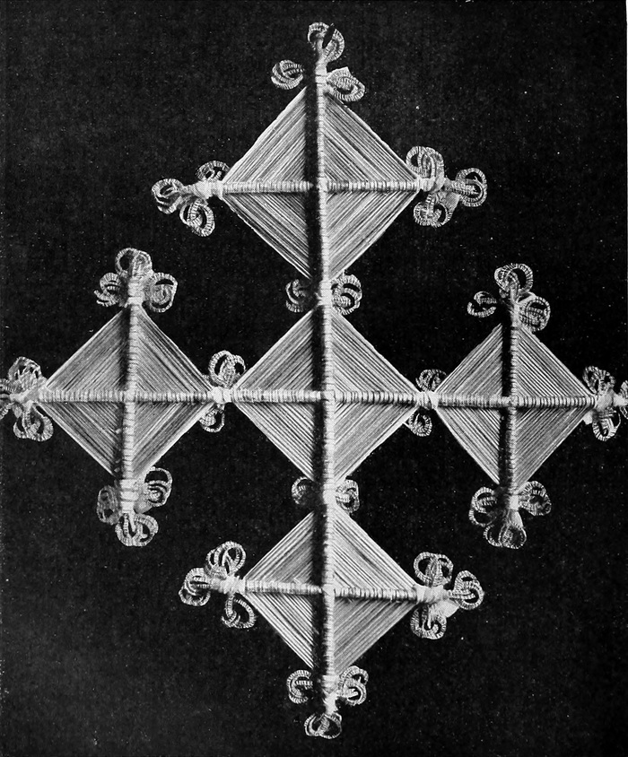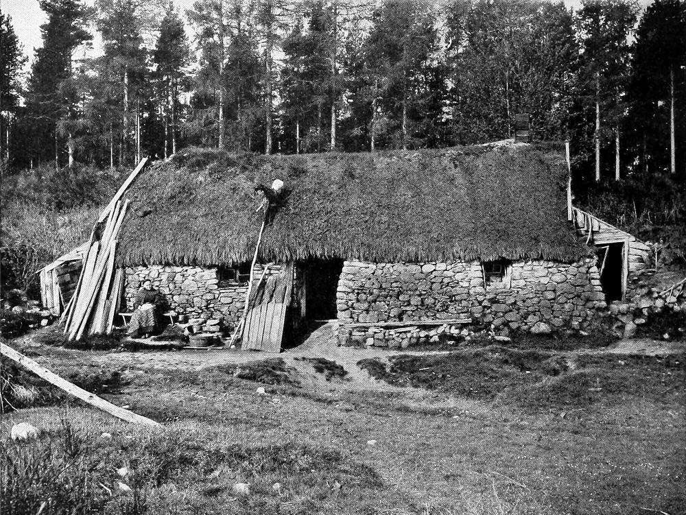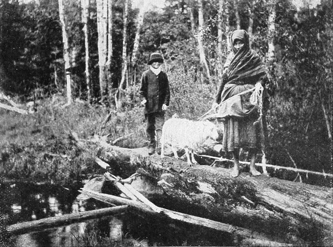 Schon im Mittelalter wurden die Finnen zum Christentum bekehrt. Doch hat diese Lehre trotz der langen seitdem verflossenen Zeit nicht vermocht, den alten heidnischen Glauben vollständig zu verdrängen (Abb. 458 und 473), denn neben dem christlichen Gott beten verschiedene finnische Stämme immer noch zu den Göttern der Vorfahren, vor allem dem[S. 415] Sonnengott und den Seelen der Ahnen. Auch die abergläubische Scheu vor meist bösen Geistern, die die Luft und die Erdoberfläche bevölkern und den Menschen übel gesinnt sind, spukt im Volke noch viel herum. In jedem Hause gibt es auch einen Schutzgeist, der mit dem Ehrentitel „Nachbar“ oder „Brüderchen“ belegt wird. Sobald bei den Permiern ein neues Wohnhaus errichtet worden ist, nimmt der Hausherr aus dem Heiligenschrein ein Heiligenbild, stellt sich damit vor den Verschlag neben den Ofen und ruft dem Schutzgeist zu: „Nachbar, Brüderchen, komm mit uns ins neue Heim; wir wollen im neuen Hause so gut leben, wie wir im alten gelebt haben; liebe meine Familie und mein Vieh!“ Darauf begibt sich alles ins neuerbaute Haus; der Hausherr läßt zuvor einen Hahn hinein und wartet ab, bis dieser gekräht hat. Das Heiligenbild wandert nun wieder in den Schrank zurück und der „Nachbar“ wird aufgefordert, im Verschlag neben dem Ofen seinen neuen Wohnsitz einzunehmen. — Auch Zauberpriester kennen die Permier noch, die zwischen den Geistern und den Menschen vermitteln sollen.