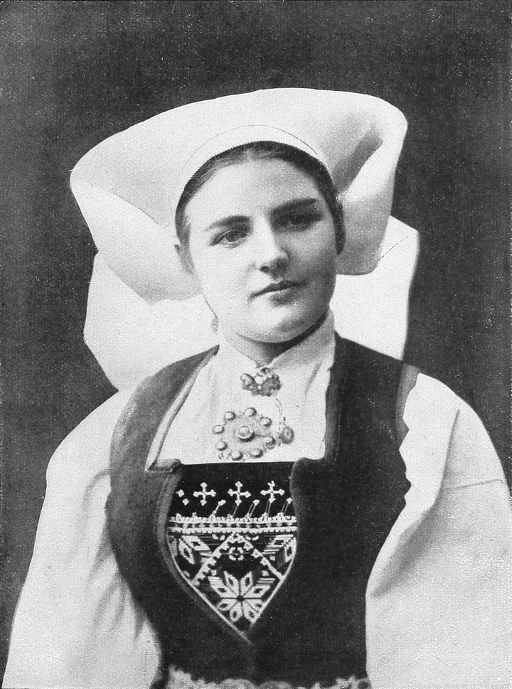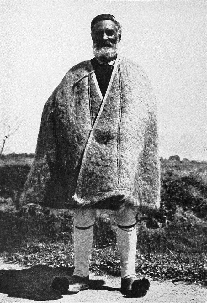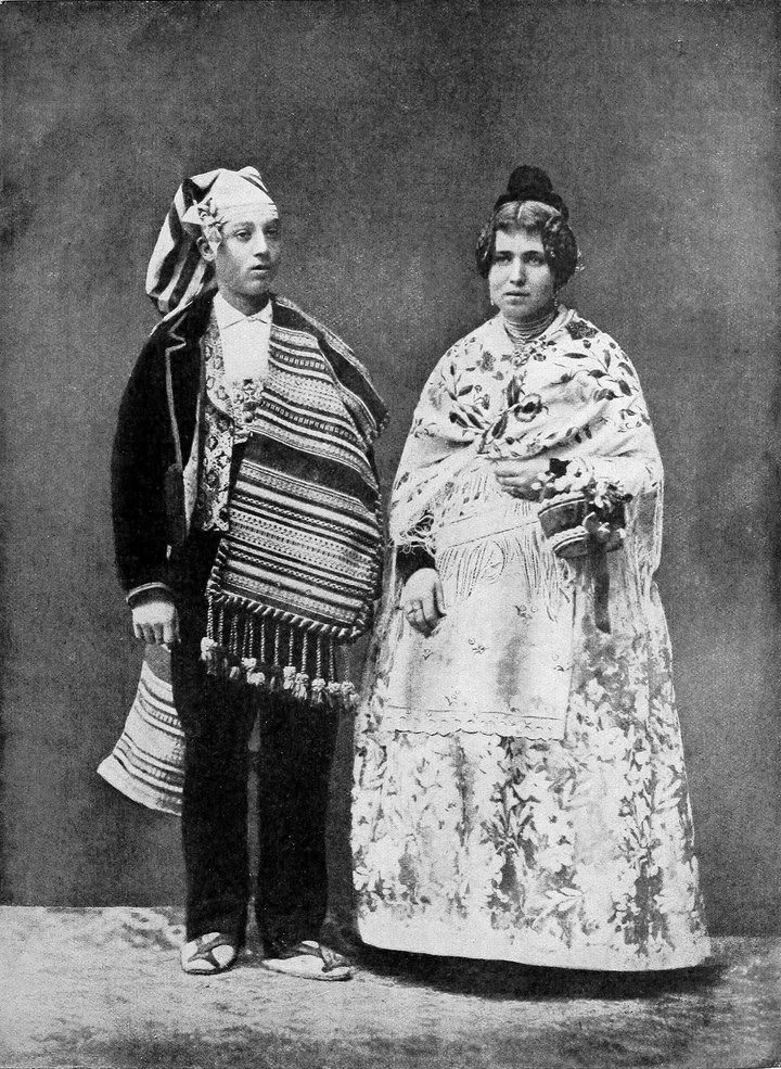 Die nationale Tracht (Abb. 465) der Basken bestand bei den Männern aus breiten schlaffen Kniehosen, schwarzen Strümpfen, weißem Hemd mit hohem, bis auf die Wangen reichendem weichen Kragen, schwarzer Jacke und runder, flacher, aus Wolle gewirkter Mütze, der Chapelak; die Frauen trugen blauen Rock mit bunter Schärpe silbergesticktes, schwarzes Mieder, das vorn über dem sichtbar bleibenden Hemd verschnürt wurde, bunte Umhängetücher und ein kleines Tuch für den Haarknoten. Bis auf die typische Mütze und die Kopftücher ist diese Tracht jetzt so ziemlich im Aussterben begriffen.