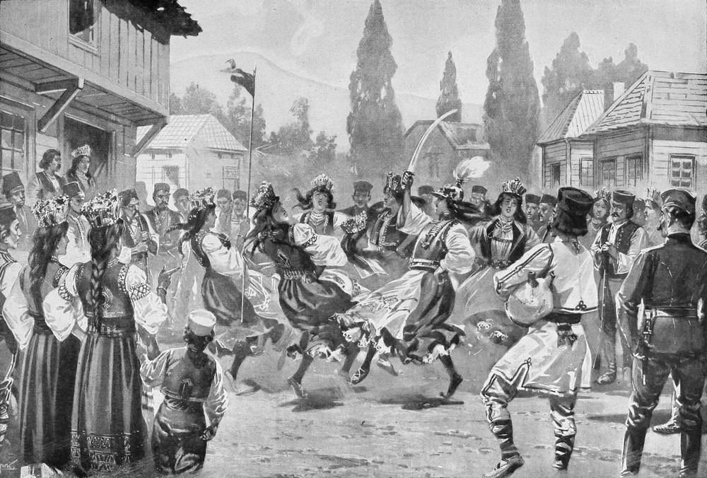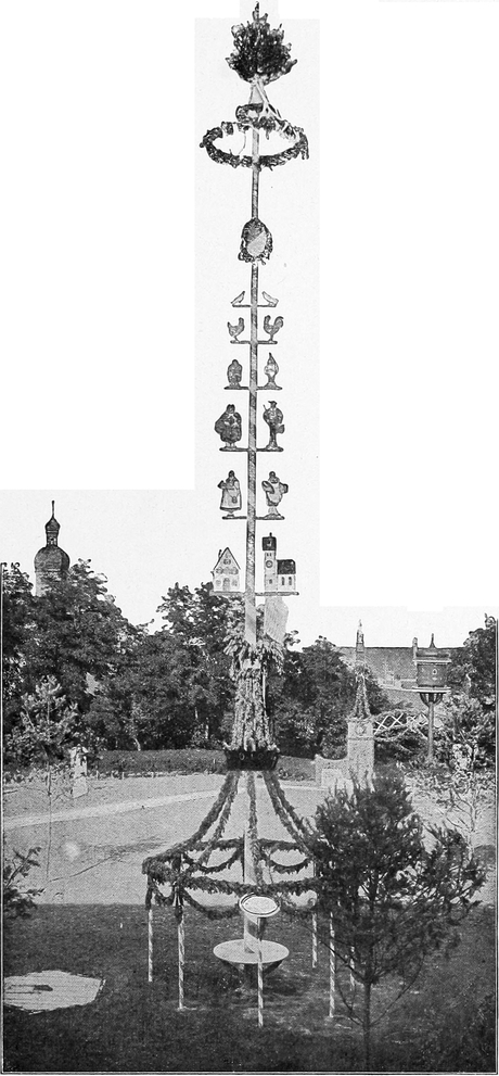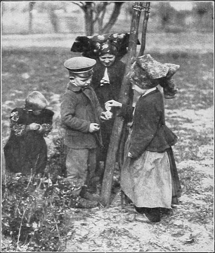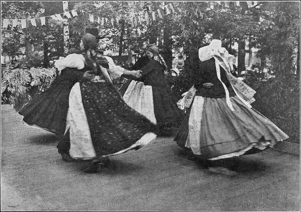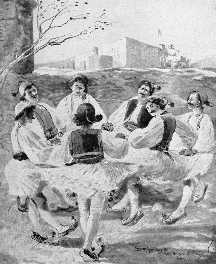 Die Feier des griechischen Karfreitags beginnt schon am Abend vorher. Alles strömt dann bereits in die Kirchen, wo neben anderen Feierlichkeiten seidene Gewänder, in die eine Darstellung des im Grabe ruhenden Christus eingestickt ist, auf einer Art Katafalk inmitten des Schiffes ausgestellt und mit zahlreichen Blumenspenden geschmückt werden. — Der Ostersonntag wird auf dieselbe Weise, die schon bei der Darstellung der russischen Gebräuche geschildert wurde, eingeleitet und gefeiert. Die Straßen sind festlich geschmückt, und überall herrscht große Freude, die in allerlei Vergnügungen, namentlich in den Nationaltänzen (Abb. 433, 436 und 442) zum Ausdruck kommt. Auf dem Lande schlachtet jeder Hausvorstand an diesem Tage ein Lamm und bestreicht mit dessen Blut einen der Seitenpfosten an seiner Haustür[S. 396] sowie die obere Schwelle. — Bei den Rumänen besteht die schöne Sitte, daß am Ostermorgen die Frauen der wohlhabenderen Stände die Gefängnisse aufsuchen, um an die Gefangenen kleine runde Kuchen, denen das Kreuz aufgedrückt ist, zu verteilen. Ostern gilt ja auch bei der orthodoxen Kirche allgemein als das Versöhnungsfest. Die ländliche Jugend aber zieht am Osternachmittag in die Eichenwälder, um hier auf dem frischsprossenden Rasen der Waldwiesen das Auferstehungsfest durch ein lustiges Spiel zu feiern. Jedes Mädchen bringt in einem Weidenkörbchen eine Anzahl buntgefärbter Hühnereier mit. Im Walde stellen sich dann Burschen und Mädchen, je in einer Reihe, einander gegenüber auf und beginnen ein Spiel, das Tanz und Ballspiel in sich vereinigt, wozu Fiedel und Dudelsack ihre Weisen ertönen lassen. Die Mädchen werfen tänzelnd den Burschen die bunten, zerbrechlichen Bälle in hohem Bogen zu, wobei sie sowohl im Tanz wie auch beim Werfen eine bewunderungswürdige Geschicklichkeit und Anmut entwickeln. Aber auch die Burschen geben ihnen nichts nach und zeigen ihrerseits eine große Sicherheit im Auffangen, so daß nur selten ein Ei vorbeifliegt. Sind die Körbchen geleert, so beginnt das Spiel von neuem, nur mit dem Unterschied, daß jetzt die Rollen vertauscht werden, die Burschen also den Mädchen die Eier zuwerfen und diese sie auffangen. Auf solche Weise vergnügt man sich bis zum Anbruch des Abends, worauf der nationale Horatanz zu seinem Rechte kommt.