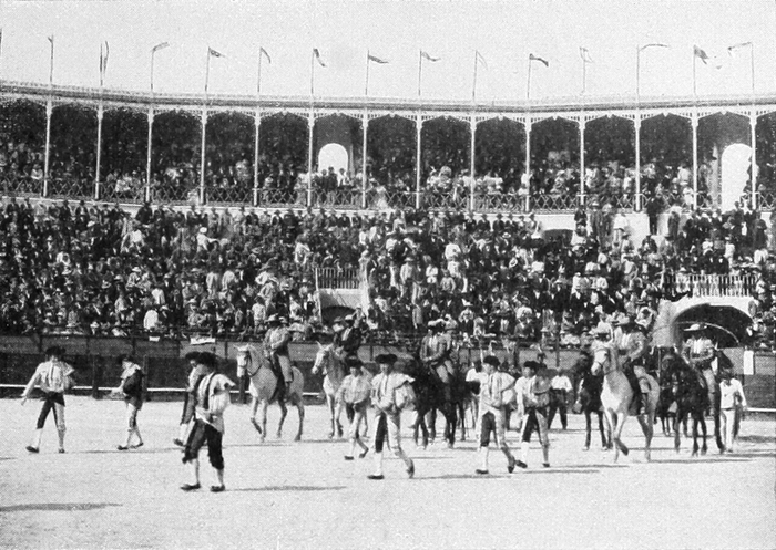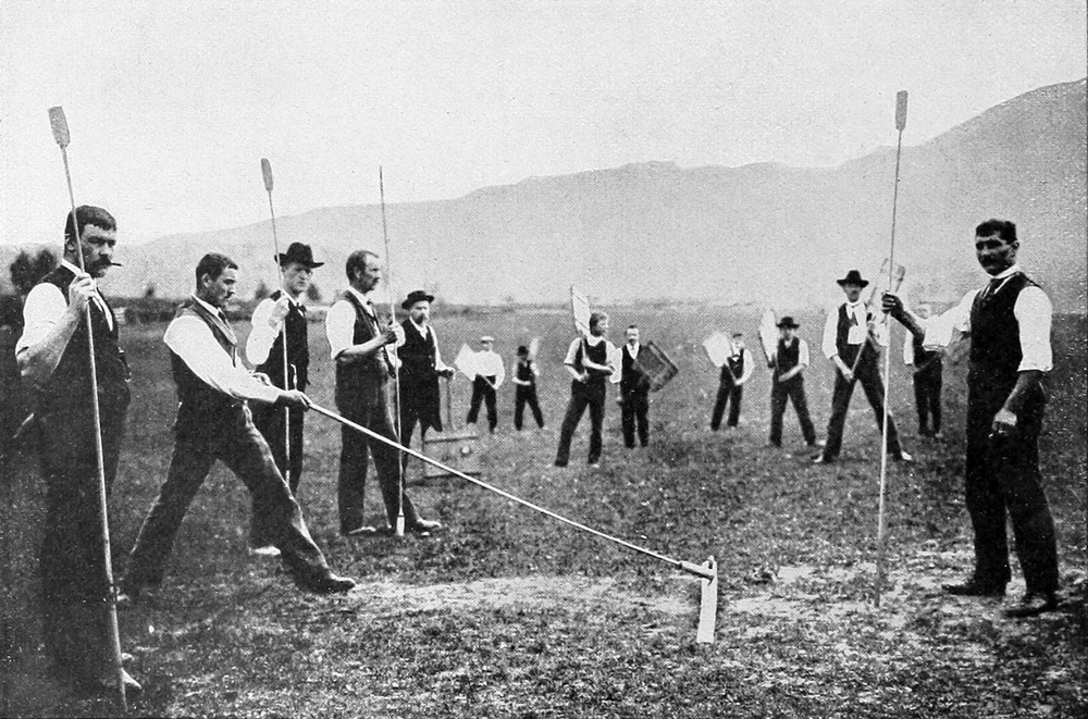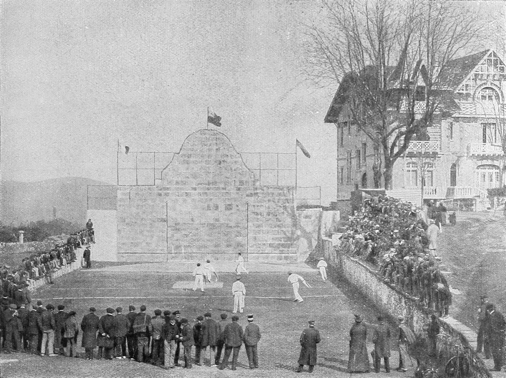Die Basken sind große Freunde von Tanz, Musik und Spiel. Der Nationaltanz, eine Art Haschtanz, hat allerdings schon vielfach den neuzeitigen europäischen Tänzen weichen müssen, dagegen haben sich die alten Musikwerkzeuge, mit denen er begleitet wurde, noch immer erhalten. Das Nationalspiel der Basken ist die Pelote, ein Ballspiel, das sich bei alt und jung großer Beliebtheit erfreut, so daß, wie man sagt, bei ihm der Baske Essen und Trinken vergessen kann. Es wird vor dem Fronton gespielt, einer breiten und hohen, oben mit einem Fangnetz gekrönten Mauer; von dieser läuft ein viereckiger Spielplatz aus, der links und rechts eingezäunt, an der Zugangseite aber offen ist (Abb. 460). Zwei Parteien, blau und rot, spielen gegeneinander. Ein Spieler wirft mit der Chistera (Abb. 459), einem aus starken Weidenruten hergestellten Wurfwerkzeug in Kahnform, an dessen hinterem Ende in einem dort angebrachten Ledersack die Hand fest eingeschnürt ist, einen Ball kräftig gegen den Fronton, während ein Spieler der Gegenpartei die Aufgabe hat, ihn im Rückflug oder nach dem ersten Aufprall vom Boden aufzufangen und seinerseits gegen die Mauer zu schleudern. Das Spiel erfordert ungemeine Geschicklichkeit.