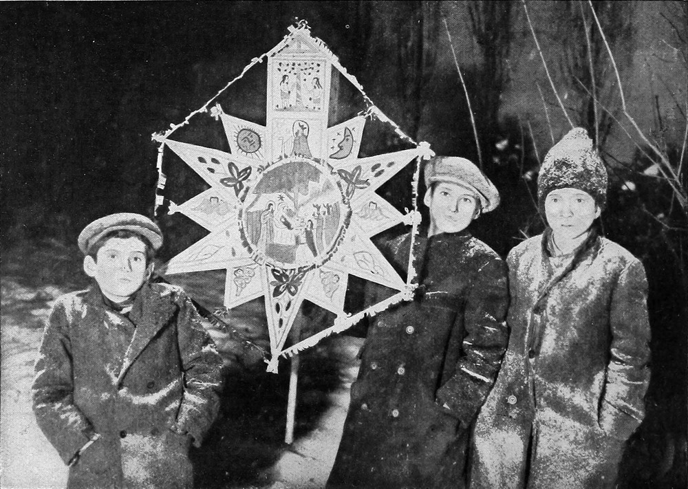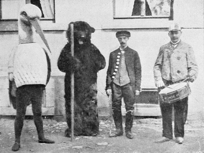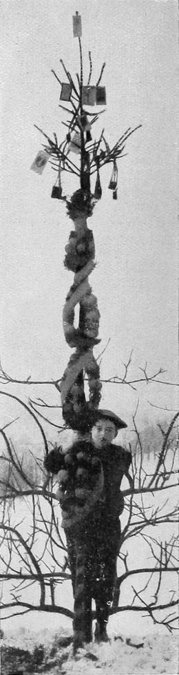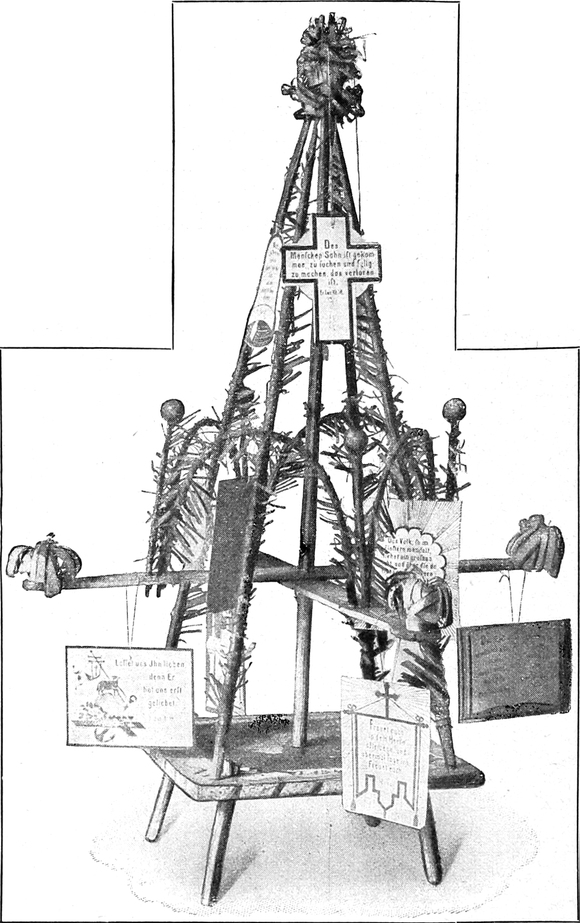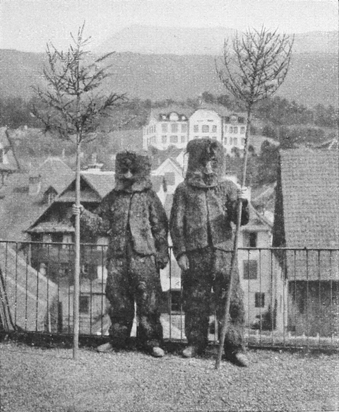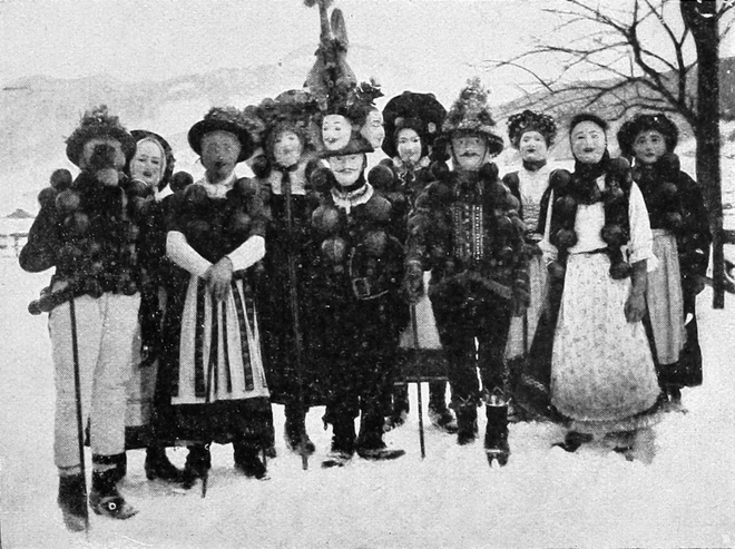Um Weihnachten herum ziehen die Kinder in Griechenland von Haus zu Haus, singen Weihnachtslieder und heimsen dafür allerlei Leckerbissen, wie getrocknete Früchte, Nüsse, Oliven und Eier, ein. In Rumänien gehen sie dabei in ähnlicher Vermummung, wie bei uns an dem[S. 397] Feste der heiligen Drei Könige (Abb. 439). Da während der Adventszeit streng gefastet wird, so tut man sich am Heiligen Abend überall besonders gütlich. — Die Zeit der Zwölften wird in Griechenland besonders gefürchtet, denn in diesen Tagen oder, richtiger gesagt, Nächten steigen nach dem Volksglauben die längst verschwundenen heidnischen Götter wieder aus ihrer Versenkung empor, aber nicht in ihrer einstigen schönen Gestalt, sondern in der abergläubischen Einbildungskraft des Volkes zu tückischen Unholden verzerrt, meistens bocksfüßigen Ungeheuern — Anklänge an den alten Vater Silen —, die in Felshöhlen und Waldschluchten hausen, nachts ihr Unwesen treiben und besonders den Frauen nachstellen. Ganz gefährlich sind sie jungen Müttern; ein Kind, das in der Zeit der Zwölf Nächte geboren wird, ist ihnen rettungslos verfallen, es muß sein ganzes Leben lang nachtwandeln und nach dem Tode „umgehen“. Das Aussprechen eines Heiligennamens oder das Hersagen eines frommen Spruches, auch das Hinhalten eines Kreuzes zur rechten Zeit schlägt die bösen Mächte in die Flucht. Daher erblickt man auch an allen griechischen Haustüren große weiße Kreuze, und am Weihnachtsmorgen segnet der Priester feierlich jede Türschwelle, beräuchert sie und besprengt sie mit Weihwasser. Mit dem Morgen des 6. Januar aber ist die Macht der Unholde für ein Jahr wieder einmal endgültig gebrochen; der dritte Hahnenschrei scheucht alle Dämonen in die ewige Finsternis zurück.