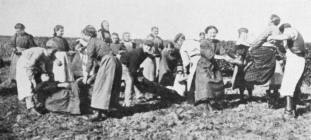 Die Basken sind vorwiegend Ackerbauer, treiben aber auch Viehzucht und etwas Schiffahrt. Ihre Sprache nimmt die Bezeichnungen für die verschiedenen Abschnitte des Jahres von der Landwirtschaft her. So heißt der November der Saatmonat (Azilla), der Juni der Gerstenmonat (Garagarilla), der Juli der Weizenmonat (Garilla edo Uzteilla), der Oktober der Einsammlungsmonat (Bildilla), der Februar der Stiermonat (Zezeilla) und so weiter. Vom Sommer leitet man die Namen für den Frühling (Udaberri = neuer Sommer) und für den Herbst (Udazkena = letzter Sommer) ab. Bei der Ausübung des Ackerbaus haben die Basken noch einige ursprüngliche Arbeitsweisen bewahrt. So benutzen sie Karren (Abb. 476) mit mächtigen massiven Holzscheiben als Rädern, die sich zugleich mit der fest mit ihnen zusammenhängenden runden Achse drehen; den Aufbau dieser Karren bildet ein Kasten aus Brettern oder ein Rutengeflecht, die Deichsel läuft bis nach hinten durch. Beim Kochen von Flüssigkeiten, besonders von Milch, wenden die Basken das althergebrachte Verfahren der Steinkocherei an, das heißt des Hineinwerfens von glühend gemachten Steinen in einen mit der zu kochenden Flüssigkeit gefüllten Holztrog.