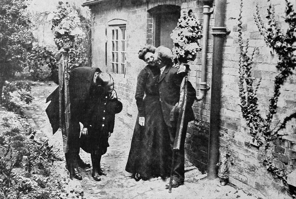 Nach der Trauung begibt sich alles in das neue Heim (Abb. 443). Hier wird die junge Frau bei den Rumänen von der neuen Schwiegermutter mit Salz und Brot, manchmal auch mit Honig und Butter bewillkommt. Bei den Griechen Mazedoniens empfangen die Mutter des Bräutigams und der Vater der Braut, die der Trauung nicht beigewohnt haben, das junge[S. 404] Paar und bewerfen es mit Zuckerpflaumen, Reis, Baumwollsamen, Gerste und auch Geld, das sich die Kinder, die dann nie fehlen, aufsammeln. Wenn die junge Frau ihr neues Heim betritt, muß sie erst über eine Pflugschar, die auf der Schwelle liegt, schreiten. Bei den Griechen ist es Sitte, daß sie bei ihrer Ankunft viermal über den Rücken des Maultieres, auf dem sie geritten ist, gehoben und dann rückwärts vor die verschlossene Haustür geführt wird. Auf deren Mitte muß sie eine Stelle mit Honig bestreichen, darauf wieder ein paar Schritte zurückgehen und einen Granatapfel gegen die Tür werfen, bis er bricht. Es gilt für eine gute Vorbedeutung, wenn aller Same am Honig hängen bleibt. Jetzt öffnet der junge Ehemann endlich die Tür und bietet seiner angetrauten Gattin ein Stück Brot mit etwas Salz an; diese tupft das Brot in das Salz und ißt davon. Bevor sie aber das Haus endgültig betritt, muß sie erst noch Wasser und Öl berühren. Nach diesem allen hebt der Gatte sie über die Türschwelle und setzt sie in eine Ecke mit dem Rücken gegen die Wand, worauf ihre ganze Aussteuer und alle anderen Geschenke vor ihr aufgebaut werden. Dort muß sie ruhig sitzen bleiben, ohne zu sprechen oder sich zu bewegen, während der Gatte und seine Freunde schmausen. Am nächsten oder an einem der folgenden Tage muß sie sich mit ihren Freundinnen zu der nächsten Wasserquelle begeben und ein Gefäß mit Wasser füllen, um die Najaden der Quelle zu versöhnen, auch eine Münze in diese fallen lassen. Bei ihrer Rückkehr gießt sie ihrem Gatten etwas Wasser über die Hände und erhält von ihm gewöhnlich ein kleines Geschenk.