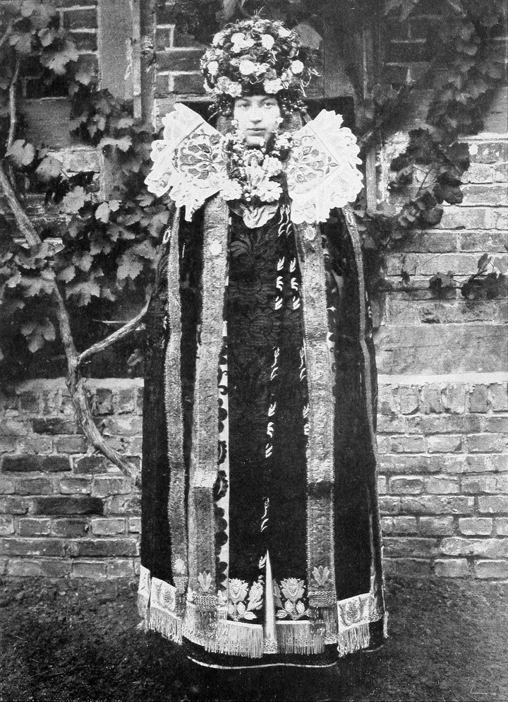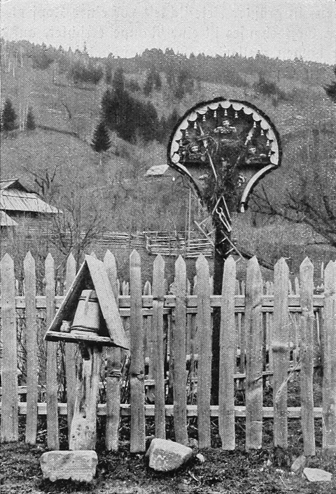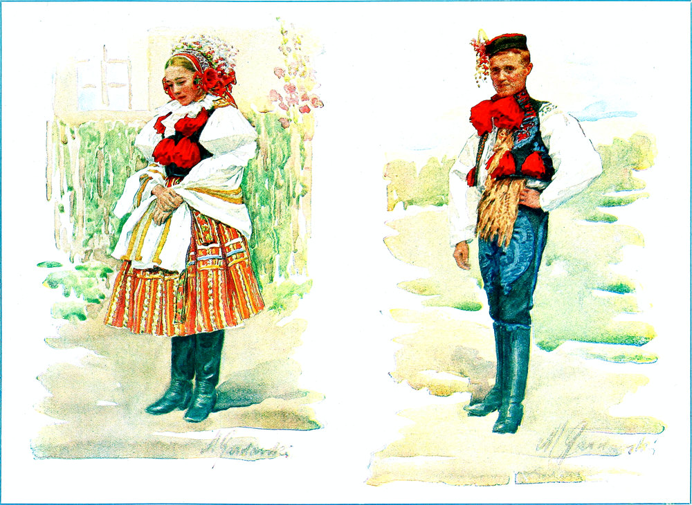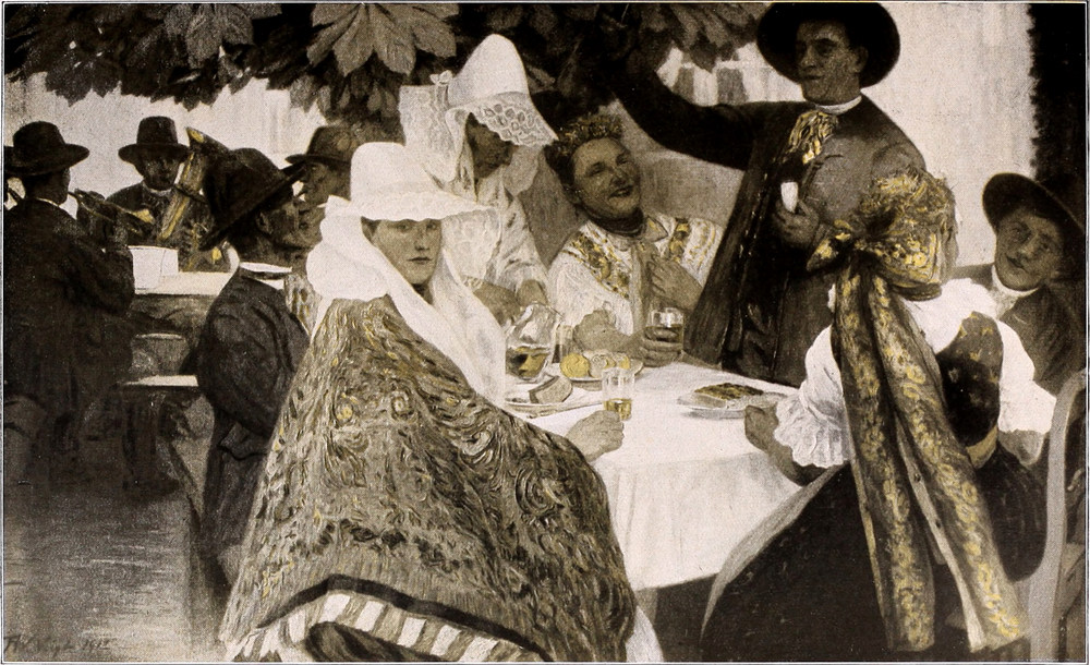 Mit den angeführten Beispielen sind die Hochzeitsgebräuche unter den slawischen Völkern (siehe die Kunstbeilage) bei weitem nicht erschöpft; man könnte über sie ein ganzes Buch schreiben, so verschieden untereinander und vielseitig sind sie bei diesen Völkern. Es soll nur noch kurz die Schilderung einer Hochzeit bei den Huzulen, einem Ruthenenstamm, gegeben werden, da die Gebräuche hierbei ganz besonders fremdartig anmuten. Der Bräutigam trägt während[S. 388] der Trauung einen Kranz, den man unter großer Feierlichkeit auf seiner Mütze befestigt hat. Er besteht aus Immergrünblättern und ist mit Flittergold und Münzen verziert; auch Knoblauch darf darin nicht fehlen, der wegen seines scharfen Geruchs als vorzügliches Abwehrmittel gegen alles Böse in hoher Gunst steht. In dem Brautkranz der Huzulin muß stets die Nadel stecken bleiben, mit der er zusammengenäht wurde. Als weiteres Schmuckstück tragen Braut und Bräutigam um den linken Arm einen großen Ring aus Käse. Nach der Trauung reitet die Braut mit ihrem Gefolge im Galopp nach ihrem Heim zurück, während der Bräutigam mit seinen Gefährten absichtlich etwas zurückbleibt. Erst wenn mit der jungen Frau zu Hause noch bestimmte Zeremonien vorgenommen worden sind, findet sich der junge Ehemann bei ihr ein. Seine Ankunft kündet er dadurch an, daß er seiner Gattin seinen Käsering hineinschickt. Diese erwidert die Aufmerksamkeit, indem sie dem Harrenden den ihrigen hinaussendet; hierauf erst nehmen die Festlichkeiten ihren Fortgang. Wenn die Braut das elterliche Haus verläßt, um zur Kirche zu reiten, gießt man ein Glas Wasser aus, damit „das Glück wie das Wasser komme“, eine Sitte, die ebenfalls als eine Schutzmaßregel gegen böse Geister aufzufassen ist.