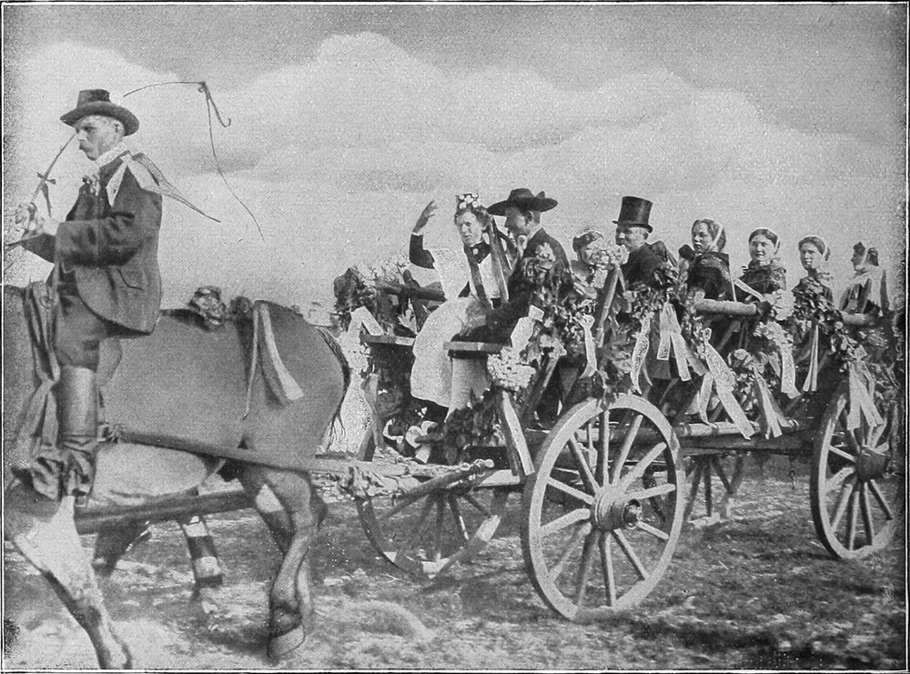 Am Hochzeitstage erwartet die Braut verhüllten Hauptes unter Absingung von Klageliedern ihren Zukünftigen. Wenn sich der Zug des Bräutigams nähert, öffnet der Brautvater die bis dahin verrammelte Tür. Ehe man aber die Gäste hereinläßt, spielen sich noch lustige Gespräche zwischen ihnen und dem Druzka (dem „Freundchen“) ab, einer Art Witzbold, der auf keiner Hochzeit fehlen darf; namentlich gibt dieser Rätsel zum Raten auf, die unter dem russischen[S. 383] Volke sehr beliebt sind. Der Bräutigam und der Brautvater müssen darauf ihren Platz neben der Braut sich durch Geldstücke erkaufen. Dann erst findet die Bewirtung der Gäste statt, bei der die Braut den „fremden Fremdling aus der Fremde“ noch einmal fragt, wie er heiße und woher er stamme. Ehe man sich zur Kirche begibt, wirft sich die Braut noch vor ihren Eltern auf die Knie, bittet sie um Verzeihung für alle ihnen bereitete Sorge und küßt sie sowie die Heiligenbilder. Sie bleibt noch immer verschleiert, bis ihr in der Kirche bei der Trauung, einer langatmigen, aber sehr anziehenden Zeremonie, bei der unter anderem wieder die Heiligenbilder geküßt werden, die Brautleute dreimal um den Altar herumgehen und so fort, der Schleier endlich abgenommen wird. Gleichzeitig spielt sich hier auch die Haubung ab, das heißt der lange Zopf wird in zwei kleinere geflochten und der Neuvermählten das Abzeichen der verheirateten Frau angelegt. Darauf begibt sich der Hochzeitszug, meistens zu Pferde, nach dem Hause des jungen Ehemanns. Hier wird das junge Paar von den Eltern mit Salz und Brot empfangen, womit der Wunsch angedeutet werden soll, daß es in dem neuen Haushalt nie an dem Nötigsten zum Leben fehlen möge. — Bei den Weißrussen müssen beide Eheleute nach der Rückkehr aus der Kirche, wie schon vorher beim Verlassen des elterlichen Hauses, über einen brennenden Scheiterhaufen reiten oder fahren, in den sie einige kleine Münzen werfen; offenbar soll damit ein Reinigungsopfer angedeutet werden und zugleich eine Abwehrmaßnahme gegen böse Geister, die dem jungen Paare etwa folgen könnten. — In Bosnien macht die junge Frau im neuen Heim drei feierliche Verbeugungen vor der Türschwelle, küßt diese und opfert einige Silbermünzen;[S. 384] die Schwelle wird, wie schon oben erwähnt, als der Sitz der Ahnen aufgefaßt. — Vielfach fährt die Hochzeitsgesellschaft in flottem Trabe von der Kirche heim; das für Rußland bezeichnende Fahrzeug ist das Dreigespann, die Troika (Abb. 419).