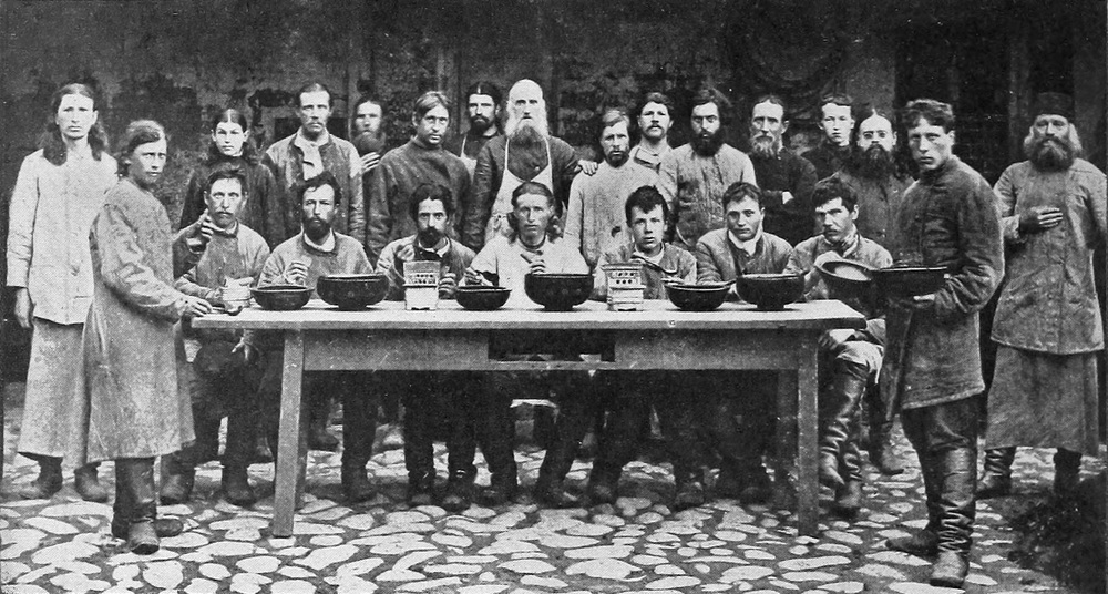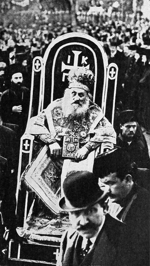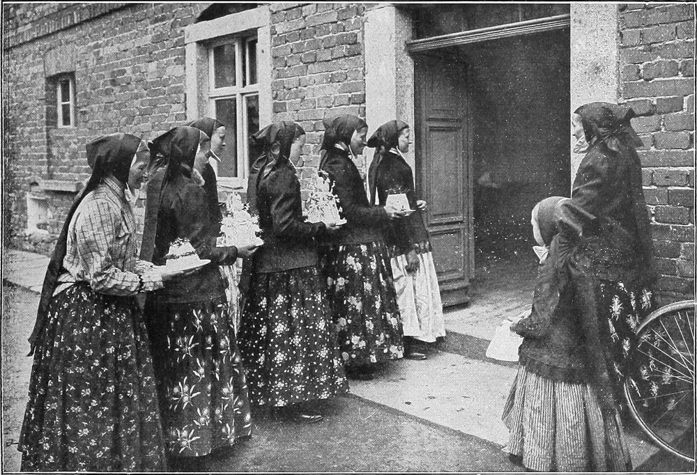 Der Leichenzug (Abb. 426) wird durch Knaben eröffnet, die das heilige Kreuz und kirchliche Banner tragen; darauf folgen andere mit großen Mulden, die Eßwaren, und zwar vor allem Kolliva, enthalten. Ihnen schließt sich die Geistlichkeit in vollem Ornat unmittelbar vor dem Sarge an, der nicht zugedeckt, sondern offen getragen wird, so daß man den Toten in halbsitzender Stellung sehen kann. Hinter dem Sarge folgen darin endlich die Angehörigen, Freunde und Bekannten. Die Weiber singen, während der Zug in Bewegung ist, Klagelieder. Bei den Serben pflegt man sich auf dem Wege nach dem Kirchhof nicht umzusehen, wie man auch auf dem Heimwege nicht rückwärts blicken darf; man fürchtet, daß sonst leicht ein zweiter Todesfall eintreten könne. Auf dem Friedhof spricht der Priester den Segen und gießt bei den Balkanslawen über den Toten eine Mischung von Rotwein und Olivenöl in Form eines Kreuzes aus, worauf der Sarg versenkt wird. Auf dem Heimwege sucht man, wenn möglich, einen anderen Weg zu gehen. Zu Hause angelangt, waschen sich alle Teilnehmer an dem Begräbnis die Hände. Außerdem nehmen sie von einer Schippe, die ihnen ein junger Mensch hinhält, ein Stückchen glühender Kohle, lassen es von einer Hand in die andere gehen und werfen es schließlich über die linke Schulter hinter sich. Auf dem Lande schließt sich hieran noch ein wirkliches Festmahl (Abbildung 423), bei dem jeder ein paar Tropfen Wein „für die Seele des Toten“ ausgießt. In den Städten verteilt man an die Armen und Bettler Speisen, Kuchen und Geld, sowohl auf dem Friedhof wie auch zu Hause. Nach dem Begräbnis wird das Haus ausgekehrt. Den dazu benutzten Besen wirft man weg; er darf nie wieder ins Haus kommen, da sonst Unglück zu befürchten wäre.