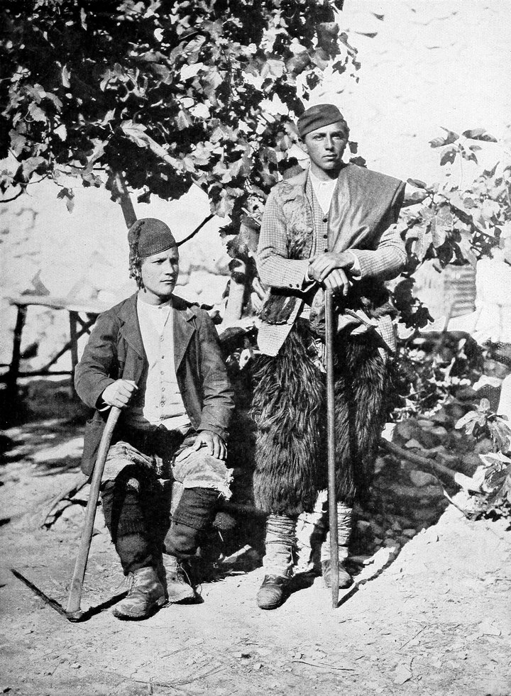 Die Nationaltracht der Griechen (Abb. 431) ist den Albaniern (Abb. 430) entlehnt. Sie besteht aus einem Hemd mit weiten, fliegenden Ärmeln, kurzen Beinkleidern, reichbestickter, blauer oder roter, ärmelloser Jacke und dem typischen weißen, in Falten gelegten Röckchen von ähnlicher Form, wie es unsere Ballettmädchen tragen, der sogenannten Fustanella, deren Bund ein Ledergurt umschließt; an ihm werden Patronentasche und Waffen getragen. Dazu kommen noch lange rote Gamaschen, rote Schnabelschuhe mit einem Knauf an der Spitze und ein hoher roter Fes mit lang herabhängender Quaste. Die Frauen (Abbildung 434) tragen ein langes Hemd mit tiefsitzendem Gürtel und darüber[S. 392] einen kurzen, weißen, wollenen Rock; die unteren Enden der Ärmel sind reich bestickt. Das mit Ketten aus aneinandergereihten Münzen geschmückte Haar wird vielfach noch mit einem Fes bedeckt, den ebenfalls eine lange, golddurchwirkte Troddel ziert.