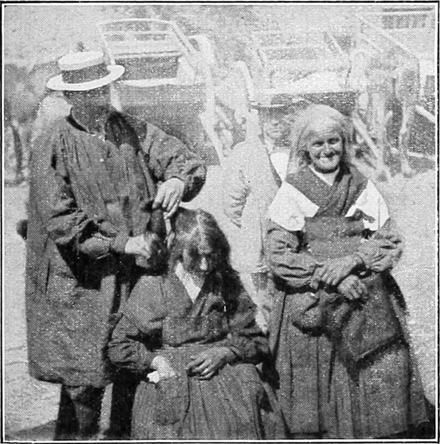 In ihrer Tracht (Abb. 469 und 475), Ernährung und Religion schließen sich die Zigeuner im allgemeinen dem Volke an, unter dem sie als Schmarotzer leben. Teils sind sie ansässig, manchmal auch zwangsweise angesiedelt worden (wie auf dem Balkan und in Ungarn); sie wohnen dann in halb unterirdischen Lehmhütten dicht bei den Städten und Dörfern, seltener in eigenen Ortschaften. Teils führen sie ein Nomadenleben, sind auf beständiger Wanderschaft begriffen und hausen dann in Leinwandzelten oder auf ihren Wagen (Abb. 463). Ihre Gesellschaftsordnung ist eine patriarchalische. Die nomadisierenden Zigeuner beschäftigen sich zumeist mit solchen Gewerben, die sich im Umherziehen betreiben lassen; sie sind Kupferschmiede, Kesselflicker, Korbmacher, auch Schirmmacher und Schirmflicker, Bärenführer, Artisten, Gaukler, Seiltänzer und Pferdehändler. Die bereits ansässig Gewordenen bevorzugen den Pferdehandel und die Musik (Abb. 470). Besonders die ungarischen Zigeuner erfreuen sich als Musikanten einer großen internationalen Beliebtheit. Dabei kennen sie meistens keine Noten — die Zigeunermusik weist daher auch keine Musikliteratur auf —, spielen vielmehr alles aus dem Gedächtnis oder auch aus dem Stegreif. Die musikalischen Gedanken und Weisen pflanzen sich auf dem Wege der Überlieferung von einem Geschlecht zum anderen fort und werden unaufgeschrieben mit ängstlicher Treue bewahrt. — Die Darbietungen der Zigeuner sind durchweg solche instrumentaler Art, besonders im Geigenspiel sind sie wahre Meister. Der Gesang tritt bei ihnen stark in den Hintergrund. — Die Zigeunerweiber gehen, wo die Stämme ansässig sind, auf die Felder zur Bestellung und schleppen Holz herbei; ihre Hauptbeschäftigung besteht aber in Wahrsagen, Kartenschlagen und Traumdeuten. Mit bewunderungswürdiger Schlauheit verstehen sie es, ihren Opfern dabei Geld abzuschwindeln. Alle diese Beschäftigungen der Zigeuner sind indessen fast nur scheinbare; in Wirklichkeit gehen sie dem Diebstahl in den verschiedensten Formen nach und fristen auf diese Weise ihr Leben.