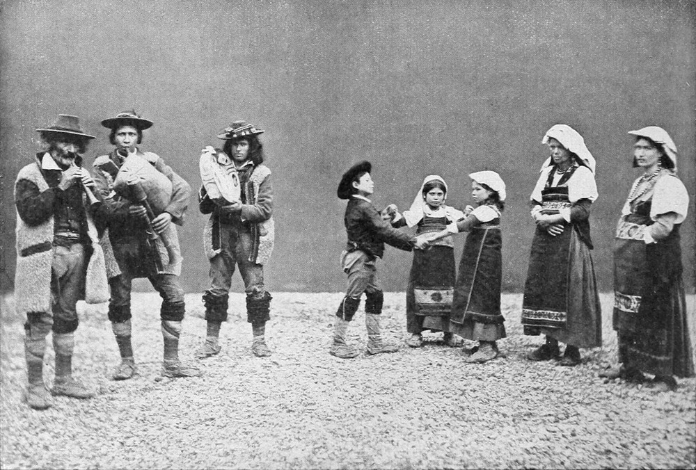 Bei der serbischen Hochzeit spielen drei Personen eine große Rolle. In erster Linie der Koom; er ist der hauptsächlichste Brautzeuge, für gewöhnlich der Sohn oder der nächste Verwandte des Mannes, der bei der Hochzeit der Eltern des Bräutigams dasselbe Amt versah. Die zweitwichtigste Person ist der Stavri svat, dem gleichsam die Aufgabe des Zeremonienmeisters zufällt. Als dritter endlich wirkt der Dever oder Führer der Braut mit, der als ihr besonderer Beschützer für diesen Tag ihr niemals von der Seite weicht. Nachdem sich die Hochzeitsgäste (Abb. 424) im Hause des Bräutigams versammelt haben, begeben sie sich zur Wohnung der Braut, und zwar für gewöhnlich zu Pferde. Voran reitet ein Mann mit einem großen Holzgefäß, das Rotwein enthält; er muß davon jedem, der ihm unterwegs begegnet, zu trinken geben. Außerdem ist er der Spaßmacher auf der Hochzeit. Ihm folgen auf einem Wagen die Brautjungfern mit den Hochzeitsgeschenken. Weiter schließt sich der Bräutigam an und endlich die lange Reihe der Gäste. Öfters stellen sich die Nachbarn mit Stangen und gekreuzten Schwertern dem Brautzug entgegen; da die Hochzeitsgäste trotz dieses Hindernisses weiterzukommen versuchen, entspinnt sich ein heißer Scheinkampf (Überreste der Raubehe), der erst beigelegt wird, wenn den Nachbarn Sühne gezahlt wurde. Wenn der Hochzeitszug endlich vor dem Hause der Braut eingetroffen ist, werden zunächst nur die Männer an den reichbesetzten Tisch geführt, während die Weiber die Braut ankleiden. Ist dies geschehen, dann wird sie von dem Bruder oder nächsten[S. 387] männlichen Verwandten zu dem Koom und dem Stavri geführt, deren Hände sie zu küssen hat, und darauf in die Küche, wo gegenüber dem brennenden Herd ihre Eltern Platz genommen haben. Sie wirft sich hier vor dem Herd auf die Erde, küßt diese oder die Herdsteine, verbeugt sich dann vor den Eltern, küßt ihnen die Hände und empfängt dafür ihren Segen. Darauf geht man in die Kirche zur Trauung (Abb. 415) und von dort nach dem Hause des jungen Gatten. Hier muß die junge Frau, wenn sie vom Wagen gestiegen ist, zunächst über einen Sack Hafer, einen Pflug und schließlich über die Türschwelle schreiten, sodann wird sie von einer Frau begrüßt, die ihr ein kleines Kind hinhält, das sie möglichst hoch aufheben und küssen muß. Dann erst darf sie ihr neues Heim betreten. Die Eltern des angetrauten Gatten empfangen sie in der Küche, wo sie sich gegenüber dem Herdfeuer niedergelassen haben. Nachdem sie auch deren Hände geküßt hat, führt die Schwiegermutter sie dreimal um den neuen Herd herum und gibt ihr in die Hand eine Schaufel, mit der sie die auf dem Herde brennenden Kohlen auf einen Haufen zusammenfegen muß. Damit sind die eigentlichen Hochzeitszeremonien erledigt; es beginnt darauf Schmausen, Trinken und Tanzen der Festgäste.