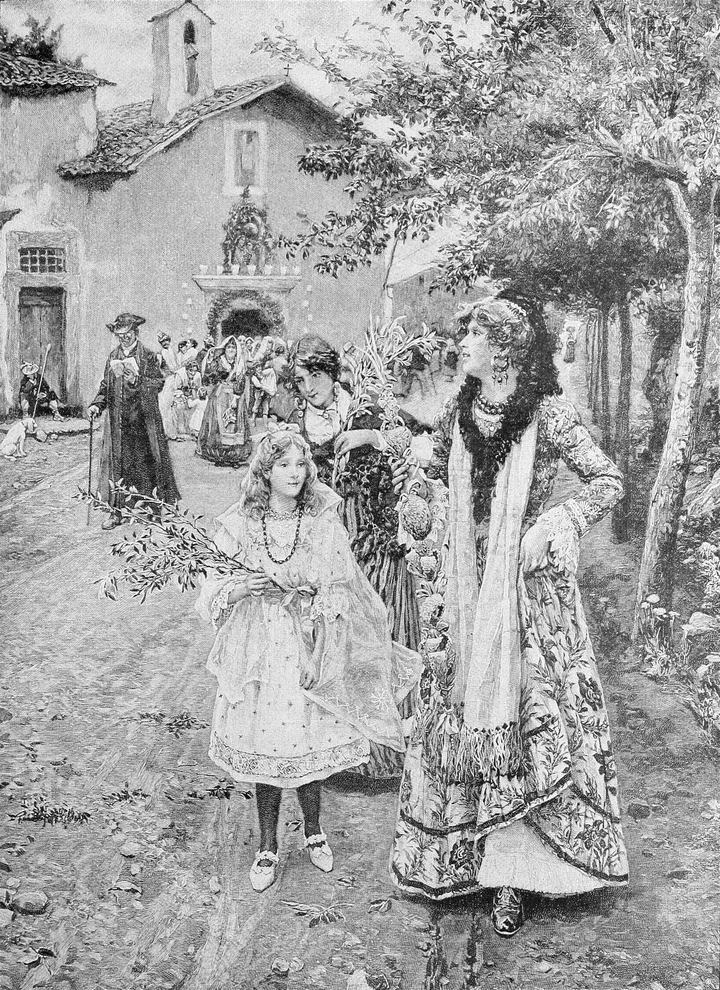 Auf der Insel Korfu wird das Fasten, das im übrigen in Griechenland strenger als sonst in der christlichen Kirche innegehalten wird, am Palmsonntag unterbrochen. An diesem Tage strömt alles vom Lande und den kleinen Orten in die Hauptstadt der Insel, um an der großartigen Prozession ihres Schutzpatrons, des heiligen Spiridion, teilzunehmen, natürlich aufs festlichste geputzt und voller Freude darüber, daß man nach dem langen,[S. 394] schweren Fasten sich zum ersten Male wieder dem Genuß von Speise und Trank hingeben darf. Die Teilnehmer an dem Zuge versammeln sich in der Kirche des Heiligen und ziehen von dort unter dem Donner der Kanonen und dem Schmettern der Trompeten in großartiger Prozession stundenlang durch die Straßen, unterwegs in verschiedenen Kirchen Einkehr haltend. Den Zug eröffnen Fahnenträger und eine lange Reihe Geistlicher in golddurchwirkten Gewändern, zahlreiche Schüler, alle in Uniform, und Soldaten; sämtliche Teilnehmer tragen geweihte Kerzen in den Händen. Ihnen schließt sich wiederum eine große Zahl von Priestern an, in ihrer Mitte der ehrwürdige Patriarch mit einer goldenen Krone auf dem weißen Haupte; in den Pausen, die die Musik macht, murmeln alle Gebete. Unmittelbar hinter dem Patriarchen folgt die Hauptsache des Zuges, der heilige Spiridion in eigener Person, das heißt seine wohlerhaltene Mumie. Sie ruht in einem innen mit Purpur ausgeschlagenen Glaskasten mit durchbrochenem Goldrahmen und wird von vier Priestern wie eine Sänfte getragen. Mit dieser Reliquie hat es eine eigene Bewandtnis. Sie gehört nämlich merkwürdigerweise nicht der Kirche, sondern ist Eigentum der korfiotischen Familie Bulgaris, die sie ihrerseits dadurch erworben hat, daß vorzeiten ein Bulgaris mit einem jungen Mädchen sich verheiratete, das die Gebeine des heiligen Spiridion als Mitgift erhielt. Für die Familie Bulgaris nun ist der Besitz der Reliquie zu einer dauernden, nicht zu verachtenden Einnahmequelle geworden. Sie hat damit zugleich allerdings die dauernde Verpflichtung übernommen, stets ein Mitglied Priester werden zu lassen, um durch diesen gegen Gebühren die Wohltaten zu vermitteln, die der Heilige bei[S. 395] allen möglichen Unglücks- und Krankheitsfällen spenden soll. Hinter der Mumie und ihren Trägern folgen wiederum zahlreiche Priester und endlich die Volksmenge, die ebenfalls festlich gekleidet ist und Palmzweige in den Händen trägt. Unterwegs drängt sich immer mehr Volk heran, besonders in die nächste Nähe des Heiligen, um durch ihn Erfüllung seiner Wünsche zu erhalten. Mütter lassen ihre kranken Kinder mit den Händchen den Sarg berühren oder legen sie wohl gar auf die Erde an der Stelle, über die der Zug kommen wird, so daß die Träger über sie hinwegschreiten müssen, andere sammeln den Staub an der Stelle, die jene betreten haben, ein oder fangen das Wachs auf, das von den Kerzen neben dem Sarge herabträufelt. — Damit ist übrigens nur eine Auswahl aus der großen Zahl derartiger Gebräuche gegeben.