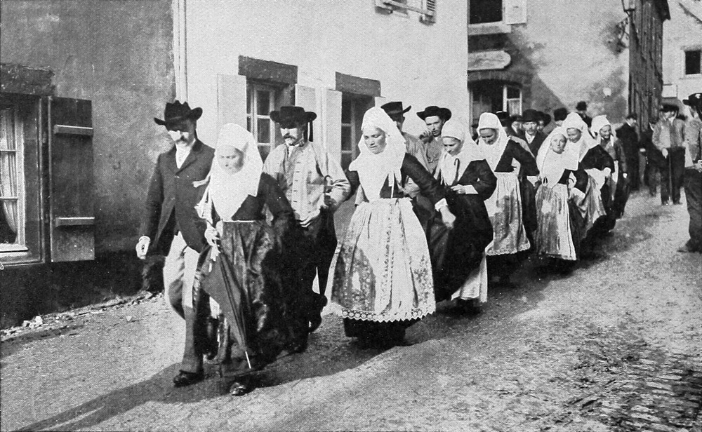 Von besonderen Begräbnisgebräuchen ist folgendes zu erwähnen. Kinder, die noch nicht der ersten Kommunion teilhaftig geworden waren, werden in offenem, weißem Sarge zum Friedhof gebracht, während Erwachsene in einem schwarzen, alte Jungfern in einem ebenfalls schwarzen, aber mit weißen Schleifen geschmückten Sarge beigesetzt werden. Alten Leuten wird ein geweihtes Hemd angezogen, das man im nächsten Kloster kauft. Wer gestorben ist, ohne gebeichtet zu haben, findet im Grabe keine Ruhe, sondern muß umgehen. Doch kann auch ein solcher noch den Eingang ins Himmelreich finden, wenn der unmittelbar vor ihm im Dorfe Verstorbene ein kleines Mädchen gewesen ist.