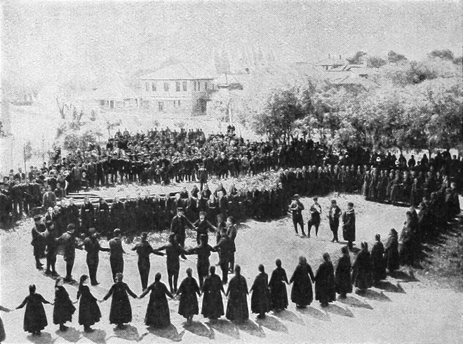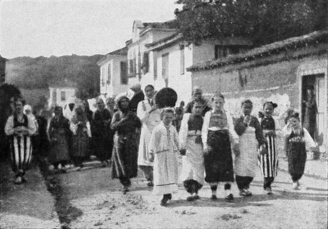 Ähnlich wie bei den Serben sind die Hochzeitsgebräuche mit geringen Abweichungen auch bei den Bulgaren. Hier begegnet man noch der eigentümlichen Sitte, daß die jung Verheirateten für eine Woche in ihrem eigenen Hause eingeschlossen werden, während deren niemand sie besuchen darf. Nach Ablauf dieser Zeit kommen die verheirateten Frauen und führen die junge Frau an den Dorfbrunnen oder zu einer Quelle, um die sie dreimal herumgehen muß, offenbar ein Fruchtbarkeitsritus, wie ihn die Volkskunde auch in Europa noch verschiedentlich nachgewiesen hat. Bei den Bulgaren Mazedoniens geht die Trauung durch den Priester vor einem eigenartig anmutenden Altare vor sich, nämlich einem Weinfaß, das auf einem Kuchen steht. Die Brautleute trinken bei der Trauung geweihten Wein aus einem Glase und gehen dreimal um diesen sonderbaren Altar herum, während die Gäste sie mit Süßigkeiten und Früchten bewerfen. Bei ihrer Ankunft im neuen Heim bestreicht die junge Frau alle Schwellen, die sie im Hause zu überschreiten hat, mit Honig, was gewiß auch als Überrest eines Opfers an die Ahnen aufzufassen ist. Schmaus, Tanz und Gesang machen auch hier einen wichtigen Bestandteil der Hochzeitsfeier aus (Abb. 425).