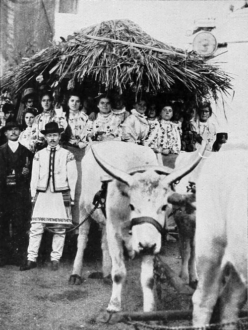 Die Trauung geht in der Kirche nach griechischem Ritus vor sich. Auch hier spielt die Braut von neuem die Widerspenstige; der Aufforderung des Priesters, ihren Gatten zu küssen, widersetzt sie sich, schlägt und knufft diesen vielmehr. Nach Beendigung der Zeremonie müssen[S. 417] die jungen Burschen wieder Gewalt anwenden, um die junge Frau in den Wagen zurückzubringen. Ist dies gelungen, geht es im Galopp nach Hause in das neue Heim. Bei ihrer Ankunft wird die junge Frau von der Schwiegermutter empfangen (Abb. 456) und von einem anderen Verwandten mit Hopfen überschüttet. Sie setzt sich dann neben den Herd und muß von neuem die Schimpfreden der jungen Mädchen über ihren Mann mitanhören. Ihre Brüder oder in Ermanglung solcher andere junge Burschen erhalten von den Verwandten des jungen Ehemanns kleine Geschenke und bewirten die Freundinnen mit Branntwein; hienach fallen sie über diese her und treiben sie mit Fußtritten aus dem Hause. Die junge Frau wird sodann ebenfalls ergriffen und trotz ihres Sträubens zu ihrem Manne in die Scheune gebracht, wo man das Beilager zubereitet hat; die Tür wird hierauf hinter dem Paar verschlossen.