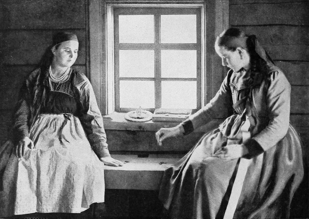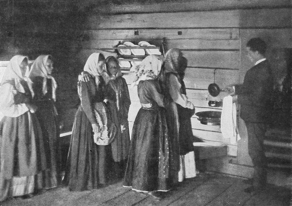 Die Hochzeitsfeierlichkeiten beginnen meist am Samstag abend. Die Mädchen erwärmen das Badehaus, fordern die Braut unter Weinen auf, es zu betreten, und stimmen in dem Raum, während sie badet, ein Klagelied in althergebrachter blumenreicher Sprache an (Abb. 457). Nach dem Bade werden der Braut die ersten Geschenke dargebracht, und zwar bietet sie ihr der Bräutigam selber auf einer Platte an. Nach langen Einwendungen berührt sie diese endlich mit der Hand, worauf der Vater oder ein anderer naher Verwandter sie in Empfang nimmt. Die Gegengeschenke von seiten der Braut, die für die Angehörigen und Verwandten des Bräutigams bestimmt sind, werden sodann auf dieselbe Platte gelegt; über ihre Verteilung beschließt eine eigens dazu bestimmte Person, der Saajannainen, das heißt Begleiter, Helfer. Bei dieser Gelegenheit fließen wiederum reichlich Tränen.