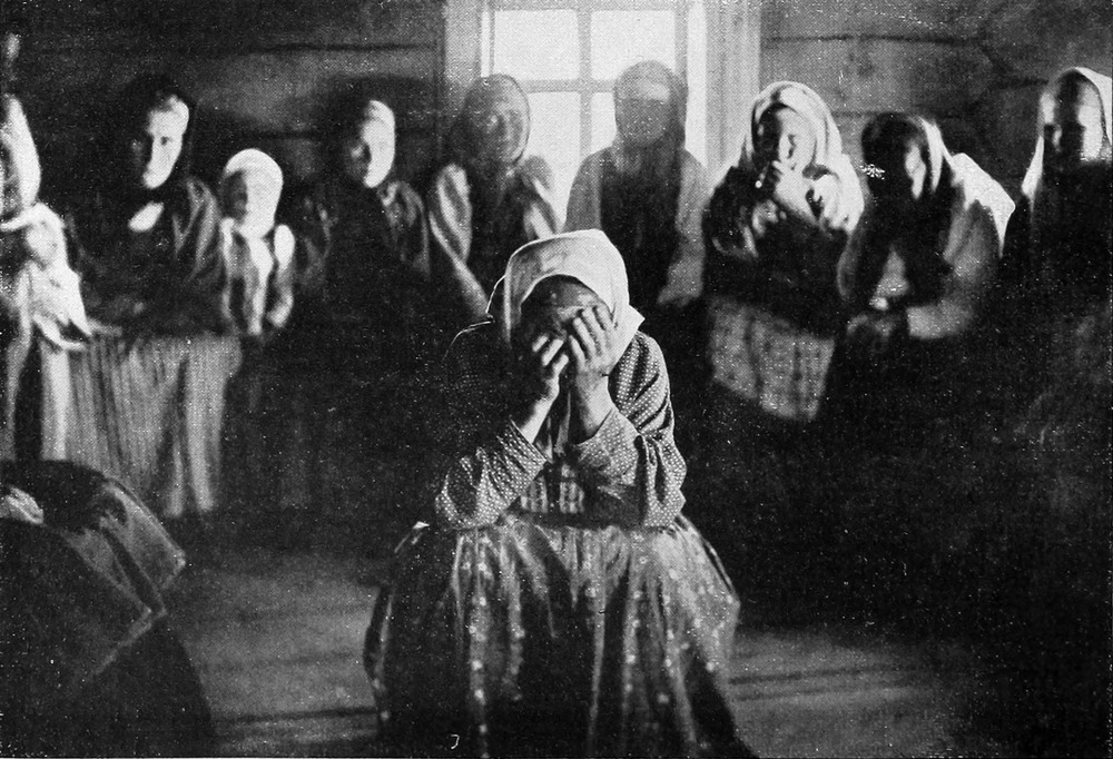 Noch umständlicher sind die Hochzeitsfeierlichkeiten bei den Kareliern. Hat ein junger Mann ein ihm gefallendes Mädchen gefunden, dann bespricht er sich mit seinen Angehörigen und macht sich in Begleitung von zwei oder drei Freunden und einem weiblichen Wesen, gewöhnlich gegen Abend, auf den Weg zu seiner Zukünftigen. Flintenschüsse verkünden stets bei solcher Gelegenheit dem Dorfe, daß wieder einmal ein junger Mann ausgegangen ist, um sich ein „wollenes Halstuch“, das ist eine Frau, zu suchen. Auf dieselbe Weise begrüßt man seine Ankunft im Heim der Auserwählten. Der Freier und seine Begleitung werden sogleich zu[S. 418] den Ehrenplätzen geleitet und unterbreiten den Eltern des Mädchens ihr Anliegen, worauf alle Verwandten zusammengerufen werden — unter ihnen darf ja nicht der Pate des Mädchens fehlen —, um die Angelegenheit hinter verschlossenen Türen zu beraten. Ist Einverständnis unter ihnen erzielt worden, dann zündet der Vater eine Kerze vor dem Heiligenbilde an und fordert seine Tochter auf, sie entweder wieder auszulöschen oder brennen zu lassen, wodurch sie ihre eigene Entscheidung bekunden soll (Abb. 453). Löscht die Tochter die Kerze nicht aus, dann erklärt sie sich dadurch mit dem Antrag einverstanden, und damit ist die Verbindung ein für allemal eine beschlossene Sache. Die nächsten männlichen Verwandten beider Parteien bestätigen dies mit Händedruck und durch Klingenlassen von Geld vor dem Heiligenbilde. Das Mädchen gilt fortan als verlobt. — Die neue Braut setzt sich nun in die Frauenecke und an ihre Seiten je eine Freundin als Klageweib. Von der anderen Seite des Hauses kommt die Mutter mit weiteren weinenden Frauen herzu (Abbildung 461). Beide Gruppen gehen einander entgegen und begeben sich dann gemeinsam in die Frauenecke, um hier den Verlobungsgesang zu „weinen“.