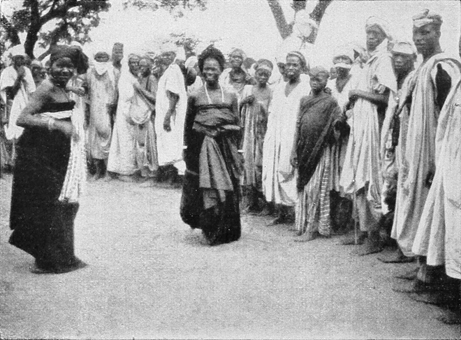 Die Namengebung erfolgt bei den Mandingo meistens acht Tage nach der Geburt, bei den Wei unmittelbar nach ihr. Vielfach erfahren die ursprünglichen Namen später eine Abänderung. Bei den Mandingo zum Beispiel tauscht man den Namen bei der Beschneidung (zwölftes bis dreizehntes Jahr) und noch einmal um das fünfundzwanzigste Lebensjahr gegen einen dann bleibenden um. Die Neger der Goldküste geben den endgültigen Namen auch erst später, und zwar auf Grund vollbrachter Taten. Bei den Mandingo wird der Name gern von den Ereignissen oder Umständen hergenommen, die bei oder nach der Geburt von Wichtigkeit waren, oder er nimmt, falls das Kind von einem Schutzgeiste des Dorfes erbeten wurde, auf dessen Namen Bezug. Auch die Bambara und Ewe geben ihren Kindern solche Weihnamen;[S. 39] bei letzteren haben diese später die Verpflichtung, ihrem Schutzpatron gewisse Dienste zu leisten. Ist der Vater bereits verstorben, dann wird bei den Mandingo dessen Name (bei weiblichen Kindern mit entsprechender Abänderung) dem Neugeborenen beigelegt. Dies beruht auf der Annahme einer Seelenwanderung. Auf eine ähnliche Vorstellung ist es zurückzuführen, wenn Togoeheleute, falls ihnen bereits Kinder gestorben sind, ein Neugeborenes aus Furcht, es könnte ihm das gleiche Schicksal widerfahren, mit „Niemand kann das Leben kaufen“ oder, falls es Ähnlichkeit mit einem Verstorbenen der Verwandtschaft aufweist, mit „Das Wiederkehrende“ benennen. Die Neger der Goldküste und von Sierra Leone sollen ihre Kinder nach dem Wochentage benennen, an dem sie das Licht der Welt erblickten. Man sieht aus diesen wenigen Mitteilungen, daß bezüglich der Namengebung mannigfache Abwechslung herrscht. Die Persönlichkeit, die den Namen gibt, ist bald der Vater, bald eine andere, meistens hervorragende Person. Die Namengebung gestaltet sich für die Eltern und die übrigen Dorfbewohner in der Regel zu einem Festtag, an dem Tanz und Schmaus nicht zu fehlen pflegen. — Bei den Haussa und anderen mohammedanischen Stämmen versammeln sich am achten Tage die Malame oder Priester sowie die Verwandten; alle erhalten Kolanüsse als ein besonderes Festgeschenk. Gelegentlich wird auch ein Schaf oder gar ein Ochse geschlachtet und verzehrt; die Hebammen erhalten davon den Kopf, die Beine und die Haut, während der amtierende Malam sich den Rücken nimmt. Nachdem dem Kinde das Kopfhaar abrasiert worden ist, erhält es zwei Namen; der eine wird ihm allein ins Ohr geflüstert, der andere aber den Versammelten öffentlich bekanntgegeben. Die Malame segnen zum Schluß das Kind, wobei sie Allahs Schutz, besonders gegen Hexerei, herabflehen, und ebenso die Brüste der Mutter.