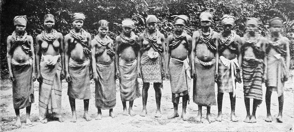 Die Bekleidung der westafrikanischen Neger ist je nach dem Grade, in dem sie von der europäischen Kultur beeinflußt worden ist, eine ganz verschiedene. Im Inneren gehen die Männer noch vielfach im paradiesischen Zustande einher, auch die Frauen, wenn man von Schmucksachen, die sie sich umhängen, absieht (Abb. 3 und 4). Meistens aber tragen sie schon einen kleinen Schamschurz; die Kinder pflegen indessen meistens ganz nackend zu erscheinen. An der Küste dagegen bedeckt man sich den Körper bereits in größerer Fläche mit Umhängen oder Tüchern (Abb. 5) nach Art einer Toga (Abb. 6 und 7), vielfach hat man sich auch bereits der europäischen Kleidung angepaßt (Abb. 9) und macht selbst die neuesten Moden mit; so aufgeputzte Schwarze wirken geradezu lächerlich.