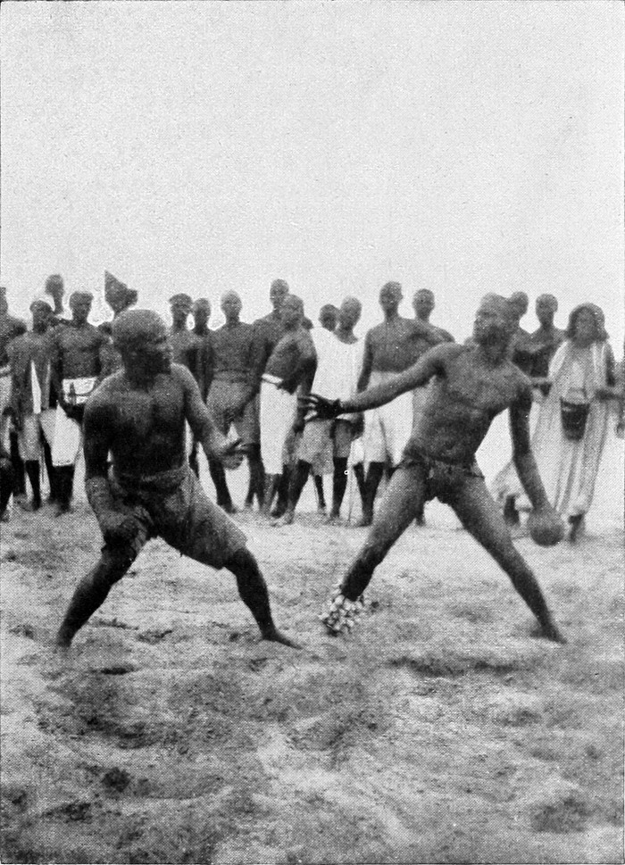Unter den Spielen begegnen wir in Westafrika dem gleichen Brettspiel, wie wir es bereits in Ostafrika kennen lernten. Bei den Mendi, wo es die Bezeichnung „Warri“ führt, hat es die besondere Form eines Kriegspieles angenommen. Es erfordert viel Überlegung und große Geschicklichkeit. Man spielt es zwischen zwei Personen auf einem kleinen Brett, das auf einem niederen Sockel steht und an seiner Oberfläche an jedem Längsrande sechs Löcher besitzt, so tief und breit, daß sie die Spitzen der ersten beiden Finger der rechten Hand aufnehmen können. Diese Löcher heißen die „Städte“; jedes Loch oder jede Stadt wird von vier Kriegsknechten, gewöhnlich in Gestalt von Bohnen, besetzt gehalten. Nachdem die zwölf Städte mit ihrer Kriegsmannschaft belegt worden sind, geht jede Partei darauf aus, die andere zu besiegen oder „aufzuessen“, wie sie es nennen. Das Spiel wird so lange gespielt, bis beide Armeen so weit geschwächt worden sind, daß weder auf der einen noch auf der anderen Seite ein Mann übriggeblieben ist. Als Sieger gilt derjenige, der die meisten Gefangenen gemacht hat. Jede Stadt pflegt ihr Warribrett zu besitzen, und der Mendi ist so in sein Spiel vernarrt, daß er, so oft sich Gelegenheit bietet, eine Partie macht. — Ein anderes volkstümliches Spiel desselben Volksstammes ist das „Se“ (Abb. 82), an dem sich vier Personen beteiligen. Es besteht darin, daß jeder Spieler einen kleinen aus Elfenbein geschnitzten Kreisel auf einer Matte wirbelt und aufpaßt, ob dieser einen oder alle Kreisel seiner Gegner verdrängt. Verlierer ist der, dessen Kreisel dem des anderen weichen mußte. In früheren Zeiten bestand der Einsatz, um den gespielt wurde, geradezu in Menschen. Ist dieses Spiel bis zu einem gewissen Grade schon Hasardspiel, so trifft dies noch mehr für das „Jiggi“ zu. Es wird mit vier Kaurimuscheln gespielt, deren konvexe Oberfläche abgeschliffen ist. Ein Spieler nimmt die vier Muscheln in die Hand und wirft sie mit einer geschickten Wendung in die Höhe. Je nach dem Ausfall des Wurfes bedeutet er Gewinn oder Verlust; fallen alle vier Muscheln mit der geschlossenen oder auch mit der offenen Seite auf den Boden, so hat der Spieler verloren; liegen aber zwei mit der geschlossenen und zwei mit der offenen auf dem Boden, so hat er gewonnen. Als ein ernst-wissenschaftliches Spiel der Mendi ist schließlich noch das „Ke“ zu nennen; man spielt es auf einem festen Stück Holz, das in schwarze[S. 33] und weiße Vierecke eingeteilt ist, mit kegelförmigen Figuren von zweierlei Größe, Männer und Frauen genannt. Die Züge sind dieselben wie bei unserem Damspiel.