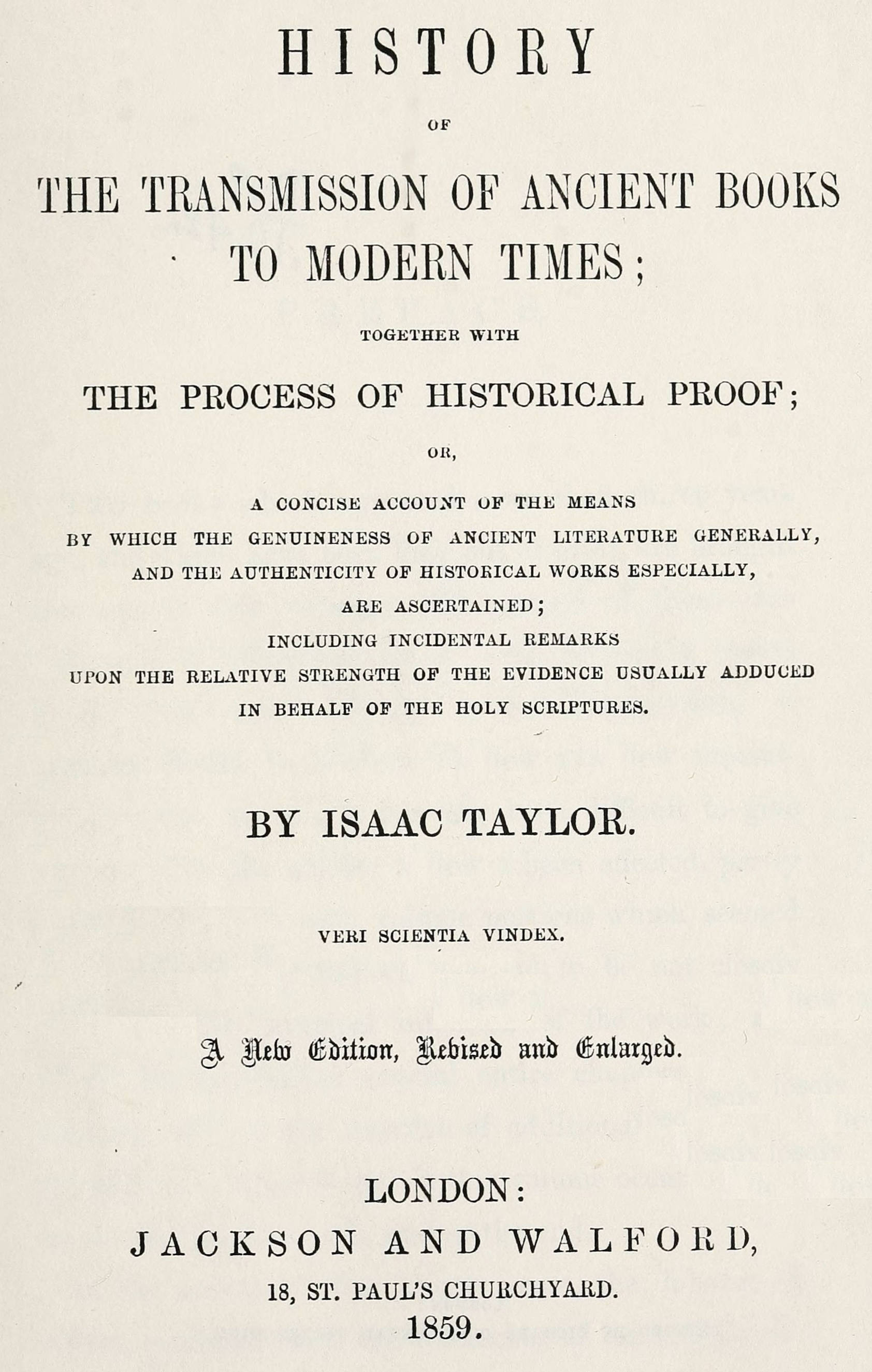 Two books which appeared more than thirty years ago, and which have been long out of print, are brought into one in this volume. The second of them—the “Process of Historical Proof,” was, in fact, a sequel to the first—the “History of the Transmission of Ancient Books to Modern Times.” In now reprinting the two, as one, it has not been difficult to give continuity to the whole: this has been effected, partly by removing from each volume portions which seemed to be of secondary importance, and to be not closely related to the principal intention of the work; and partly by introducing several entire chapters of new material; and by the insertion of additional paragraphs throughout. What is new in this volume occurs chiefly in the mid portions of it, and at the end.