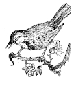 "One afternoon I lit in an old tree to plume my feathers and rest a bit. Hearing a chirping below me, I looked down and saw a lark's nest hidden among some tall grasses. The father and mother lark were flying about looking for worms and insects to feed their hungry family. They were so happy! They seemed to love one another so much, and how proud they were of their babies! It kept them pretty busy to get enough food. Often they would be away for some time.