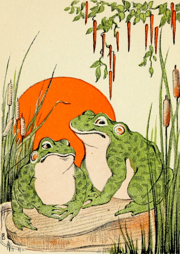 The next morning after the ducks went away, the sun looked down smilingly on the home of the happiest little people in all the world. The most joyful chorus ever heard rang out over the pond. Every frog, big and little, was hopping about singing lustily. The old bullfrogs sang in their deep bass voices, "Kerrump, ker-r-rump, rump, rump, rump, ker-rumpety, rump." Above them could be heard the high, clear tenor voices of the tree frogs as they sang, "Ker-rump, ker, ker-rump, ker-r-r-rumpety rump." And the young bullfrogs kept time with the others in the squeakiest of tones, saying, "Ker-ker, ker-rump, ker-ker, ker-rump." Even Mrs. Toad and the mother frogs, who, we know, haven't much music in them, were making a brave attempt to say, "Ker-rump."