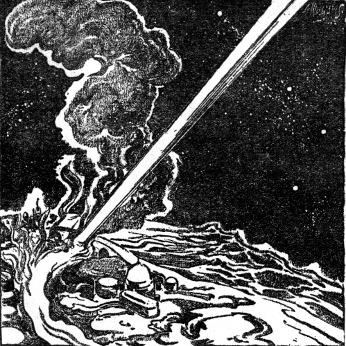 Then without warning, the scintillating sun went out, and left Pluto once more the God of Darkness. It came on again, as the rear element extended and shortened the focal length once more to a degree slightly less than the length of the complex lens. It oscillated, and it wavered, and it danced from spot to spot on Pluto. Where it touched with perfect focus, it seared the ground and sent up huge gouts of flame and tortured earth as the whole output of the sun bore down upon a small circle. It hit the Sulphur Sea, and sent great steaming clouds of vapor floating across the twin cities. It cut a sear across the center of Bifrost Bridge, and cut the famed bridge in the middle of the span. Bifrost broke and fell into the River Styx—and like the famed tale of Ragnarok, the falling of Bifrost Bridge preceded a period of terror.