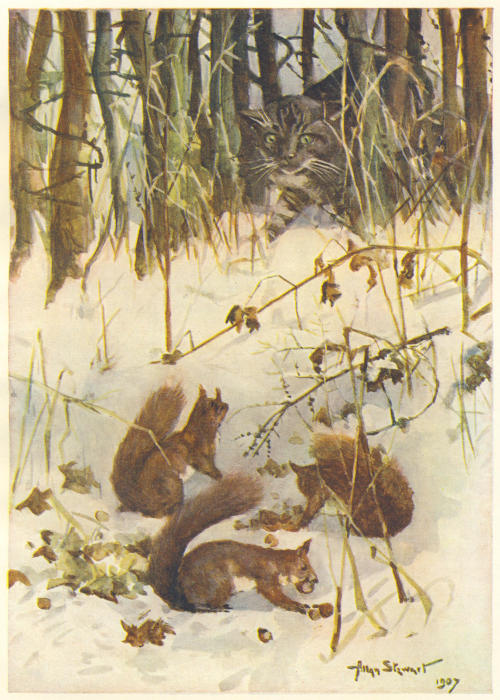 Mother gave a low note of warning that none of us should move or make any noise; and you may be sure we all obeyed, for something in her manner frightened us greatly. Presently we heard heavy footfalls down below rustling in the dry pine-needles. We sat closer than ever, hardly daring to breathe. The footsteps stopped just below our tree, and a loud rough voice, that made every nerve in my body quiver, shouted out something. From the sound of it we could tell that the speaker was peering right up between the boughs into our tree, and we knew without the slightest doubt he had discovered our drey. He must have spoken loud, even for a human, for his companion gave a sharp ‘S-s-sh!’ as if he were afraid that some one else might overhear and come down upon them. It could not have been of us he was afraid, for we, poor trembling, palpitating little things, lay huddled together, hardly daring to breathe.