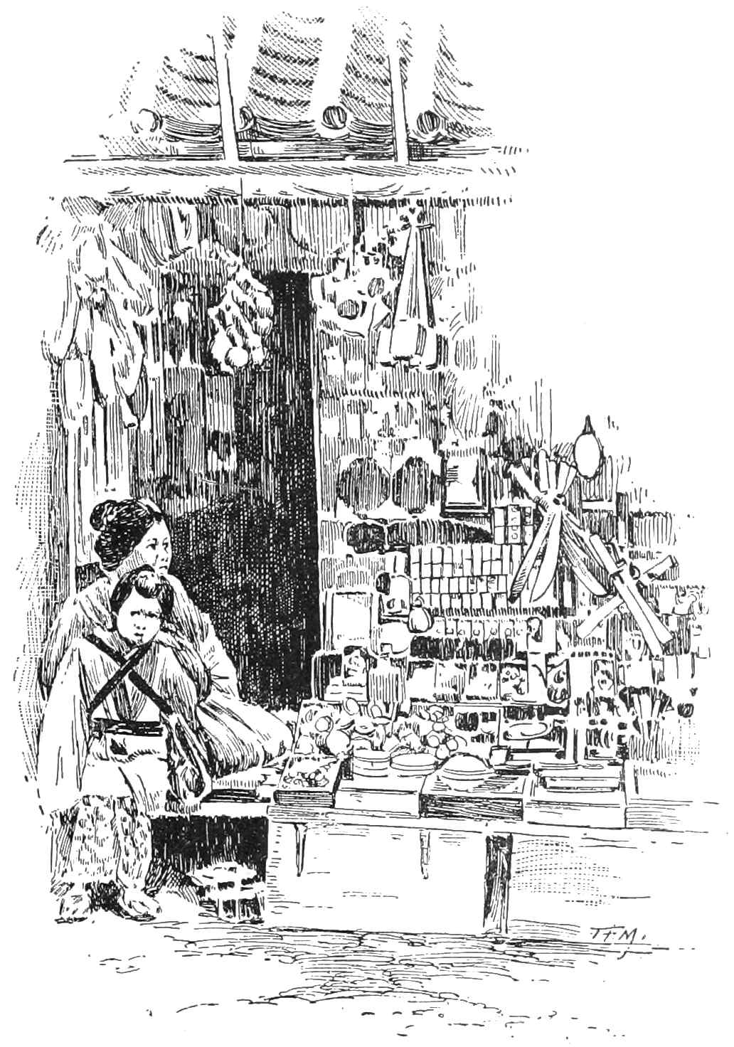 If you are a woman you will not be likely to buy any of these articles of war, and you will find it a relief to escape the fiery eyes and low-hanging tongue of that mask in the corner. The proprietor calls your attention to a rickety staircase, and invites you to ascend into the second story. By so doing, you will soon find yourself in a little room which reveals altogether a different sight to the one below. You have left the domain of war and blood, and are now surrounded by suggestions of religion and art. There are Buddhas of every kind,—wooden, bronze, and gold; there are dainty little tea-pots, porcelains, candlesticks, and altar-pieces, to satisfy the most exacting taste; there are highly-polished mirrors gracing the walls, and another collection of swords, of a perhaps less warlike appearance than those below.64 The scene has graceful touches, for the small children of the family are huddled together on the floor, amusing themselves with such Japanese playthings as grasshoppers and crickets. These are their dolls, and they would never lay them aside for the less animated toys of the Western world. The wife of the proprietor is always at hand, who supplements the bows of her husband with dimpled smiles of her own, and who treats you with a respect that is not too distant to be friendly. She is sitting on the floor in front of a small hibachi. You have not been in the room long before you hear that little quiet steaming that you now know so well, and soon the little woman rises and, with a smile and bow, leaves the room.