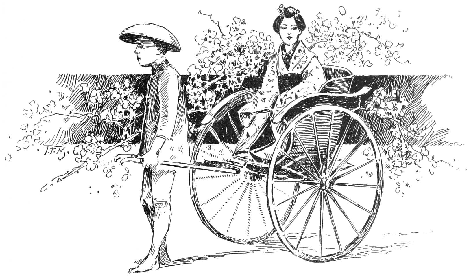 I had hardly been comfortably seated when I saw my companion ride past, borne by much nimbler and more youthful legs than those of my poor old Cho. Riding in Japan is the most unsocial thing in the world. Each traveller has a jinrikisha to himself, and the carriages are compelled by law to move in single file, so that the streets may not be blockaded. It is true that they will sometimes hold more than one person; but these conveyances are meant for the Japanese alone, who are so light that two can247 be carried by one man. The constant parade of the jinrikishas, therefore, through a large thoroughfare, is very interesting. It makes no difference how many people there may be in your party; one must follow another in regular order, or your offending coolie may find himself in the lock-up before the day is over. You can easily see the disadvantages of this state of affairs; it makes conversation almost impossible,—and who can travel with pleasure if he cannot talk?